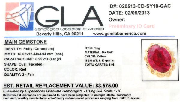 APP: 3.6k 14 kt Gold, 6.95CT Oval Cut Ruby Ring