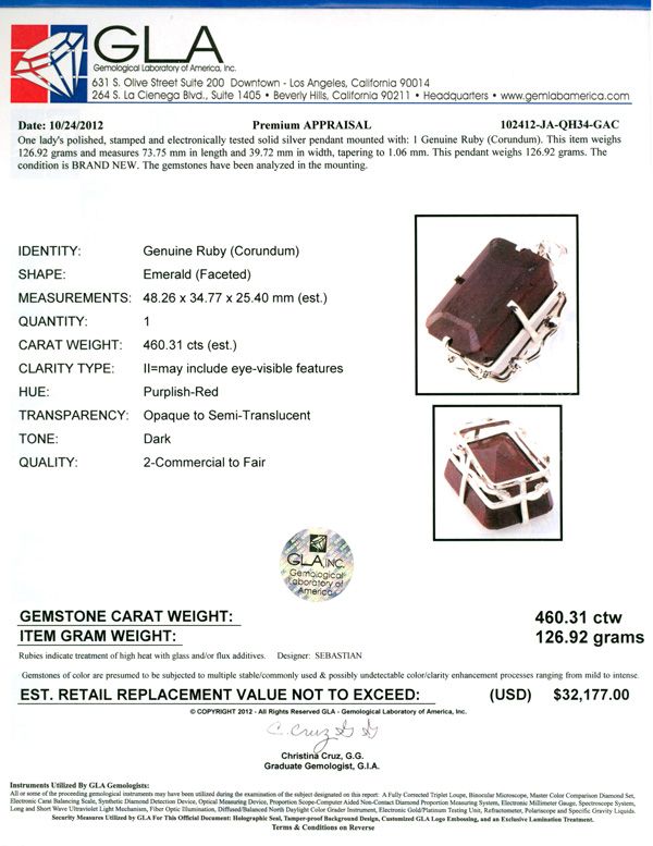 Designer Sebastian 460.31CT Emerald Cut Ruby and Sterling Silver Pendant