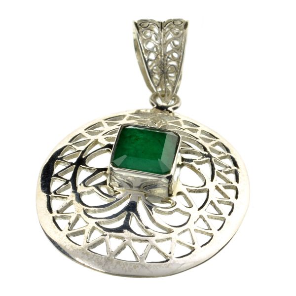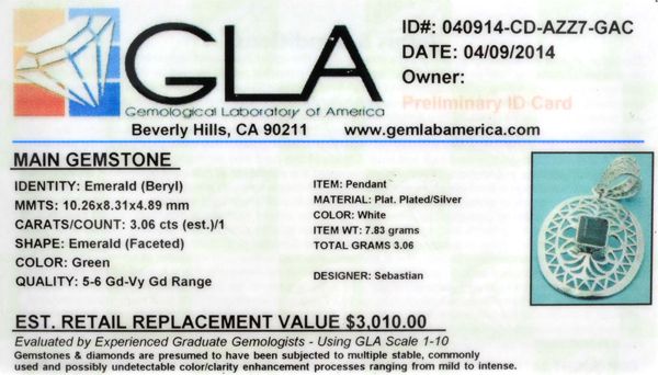 Designer Sebastian 3.06CT Emerald Cut Green Beryl Emerald And Platinum Over Sterling Silver Pendant