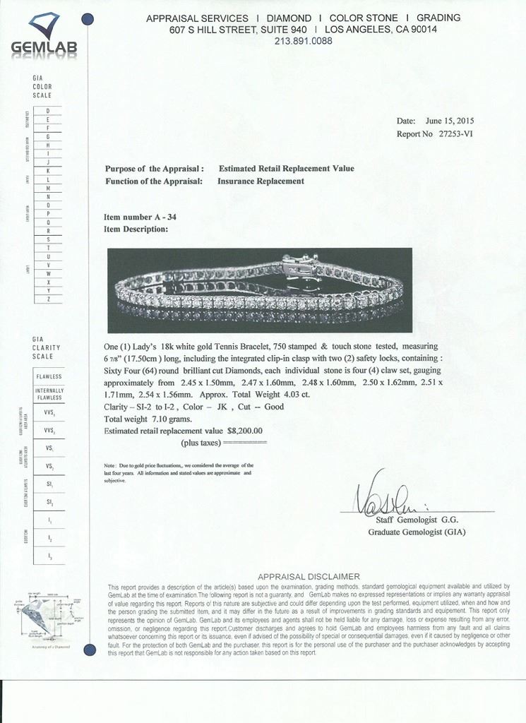 APP: 8.2k *Fine Jewelry 18 kt. White Gold, Custom Made 4.03CT Round Brilliant Cut Diamond Tennis Bra