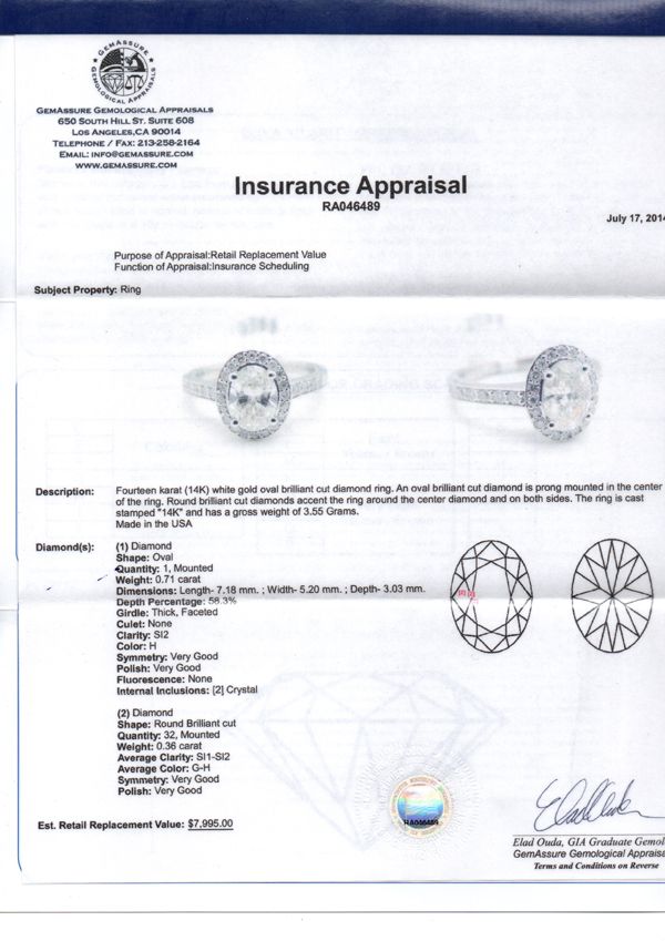 GovernmentAuction.com utilizes Retail Replacement Value Appraisals, which are the most common. These types of evaluations are written for insurance needs. This would be the cost to replace the jewelry, with an item of equal quality and kind, considered to be the current market price or the replacement value. This type of appraisal is done to protect you in the event of damage or loss of a valuable item. Our appraisals are conducted by and independent 3rd Party appraisal firm that utilizes Certified GIA Gemologist, if more information is needed you are welcome to contact them directly: Gemological Laboratory of America- info@gemlabamerica.com. Appraisals should be used for verification of gemstone and/or metal weight, size, and grade only, not actual value. Appraisal value should be considered for insurance purposes only, not actual value, as price varies greatly from retail locations through-out the world. Items should not be purchased with the expectation to resell for appraisal price or for profit.