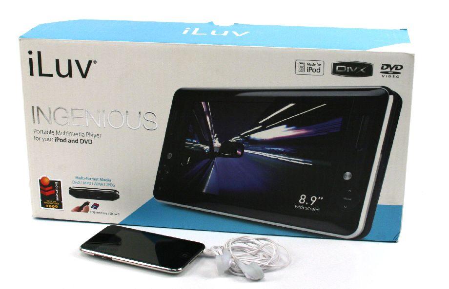 Used 8GB iPod, touch screen, with headphones. Scratches to the back, but otherwise in very good, working condition. Also included in this lot is an iLuv Ingenious portable multimedia player for an iPod or DVD. 8.9 inch widescreen digital TFT LCD face. Comes with: remote control, iPod dock adapter, AC adapter, car adapter, and instruction manual. Appears to be new in box, never used and in excellent condition.