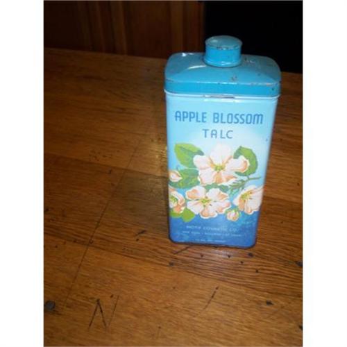 This is a nice Apple Blossom Talc Tin by the Motif Cosmetic Co. Great colors and graphics but the lid has some wear.Stands 7" tall.