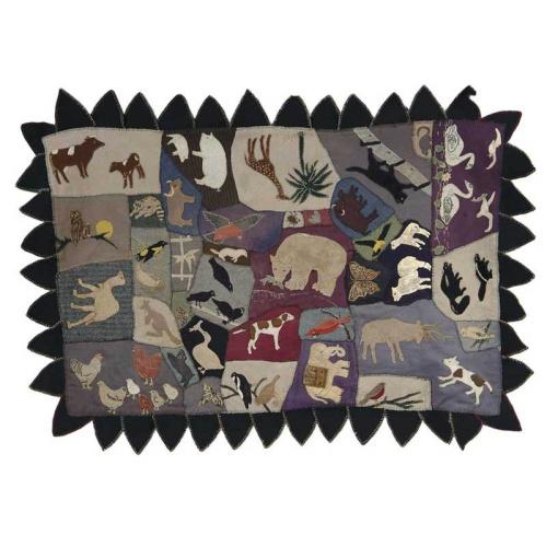 APPLIQUÉ AND EMBROIDERED 19TH CENTURY TABLE RUG. Rare table rug in rectangular form with triangular black stitched border edge. Interior set with thirty-seven patches, each embroidered with different bird, insect or animals. They are arranged in all directions so that the rug is visible from all sides. They include: Bear with fish, elephant, dog, kangaroo, duck with fish, two owls with moon, cow with calf, giraffe with palm tree, black cat, mouse, birds and much more. A great folk art piece. SIZE: Interior rectangle is 41” x 27”. Total length is 49” x 34”. CONDITION: Generally very good. 9-26426