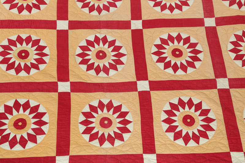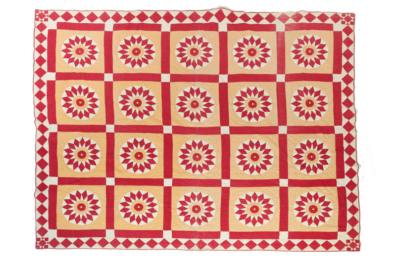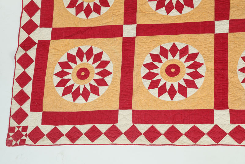 American, 3rd quarter-19th century, cotton. Rising Sun/Sunburst pattern hand appliqued and quilted. Red sashing and diamond border. 74" x 96".