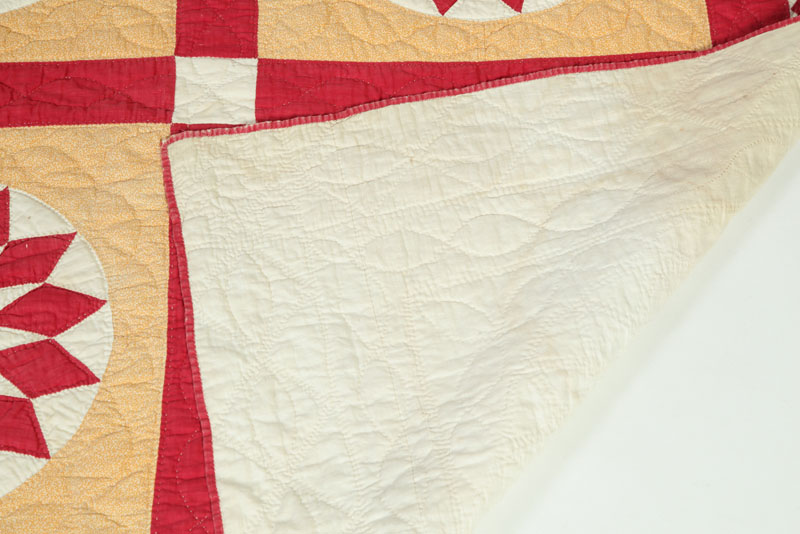 In the outer corners of the border, pieced stars are quilted with tiny heart outlines at their centers. Fabrics include solid red and a butterscotch print. The blocks are 14 inches square; 3 +ö wide borders; 7-9 stitches to the inch, counting on the top side of the quilt only. The quilt is handmade with appliquT and reverse-appliquT piecing. Batting is thin and even and the backing is muslin. Handed down in the Ballentine family (NY State).