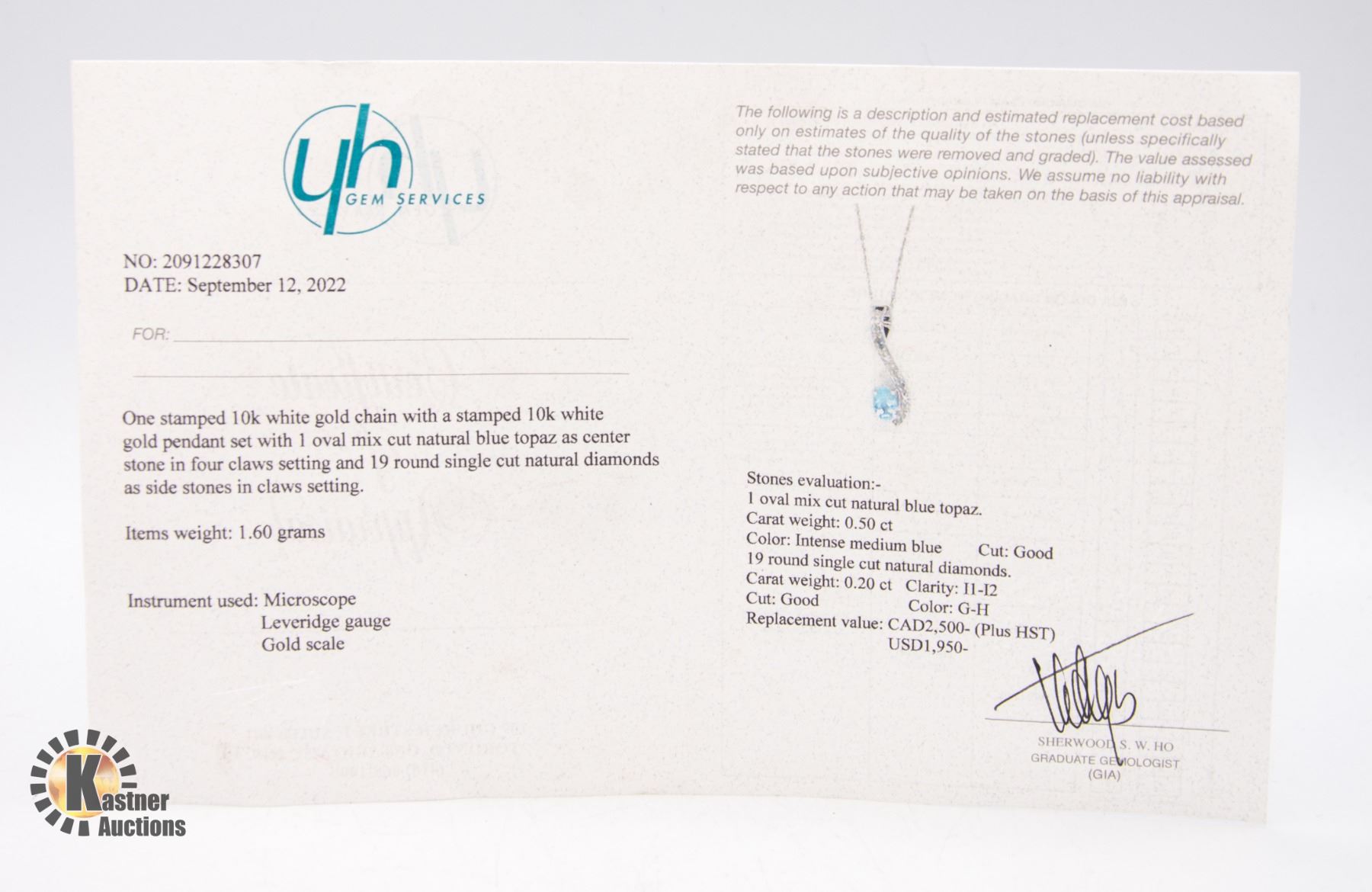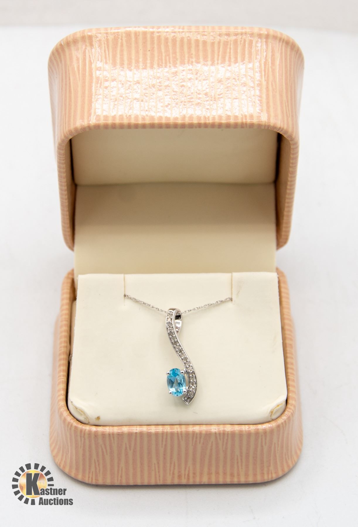 PENDANT SET WITH 1 OVAL MIX CUT NATURAL BLUE TOPAZ INTENSE MEDIUM BLUE AS CENTER STONE IN FOUR CLAWS SETTING AND 19 ROUND SINGLE CUT NATURAL DIAMONDS AS SIDE STONES IN CLAWS SETTING. 1.60 GRAMS TOTAL WEIGHT. APPRAISED AT $2,500.00 CANADIAN **ALL ITEMS MUST BE REMOVED BY 5PM SATURDAY, OCTOBER 21ST 2023. ALL REMAINING ITEMS WILL BE SUBJECT TO A $6.00 PER DAY STORAGE CHARGE. ANY ITEMS REMAINING AFTER MONDAY, NOVEMBER 6TH, 2023 WILL BE CONSIDERED FORFEITED. NO REFUNDS WILL BE ISSUED FOR FORFEITED ITEMS. TO SCHEDULE A PICK UP APPOINTMENT CLICK HERE