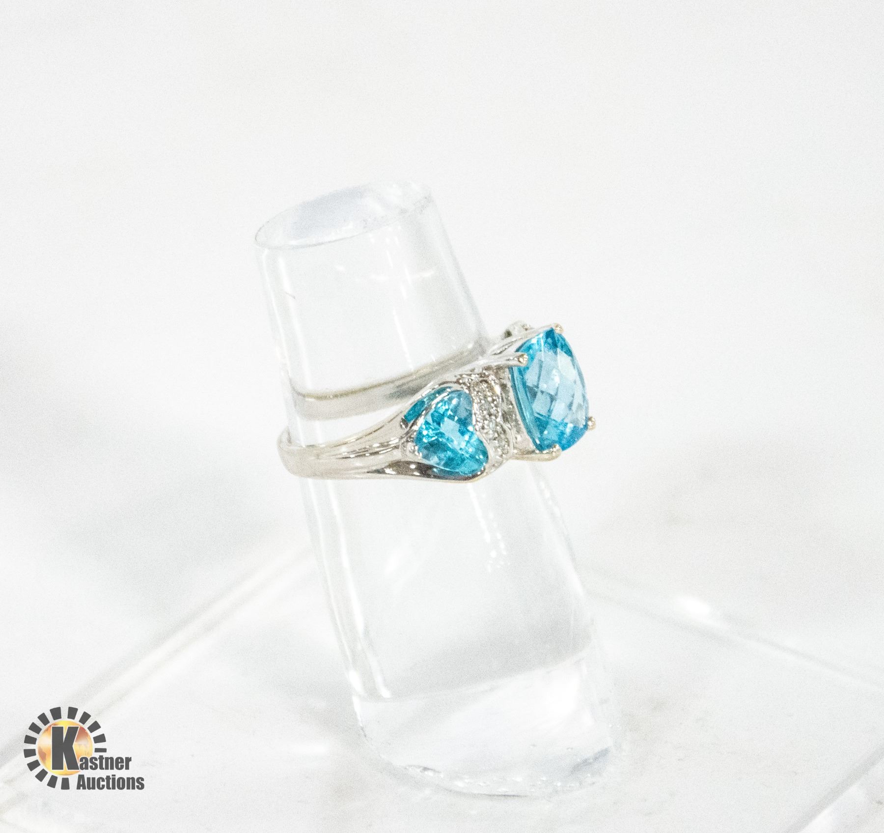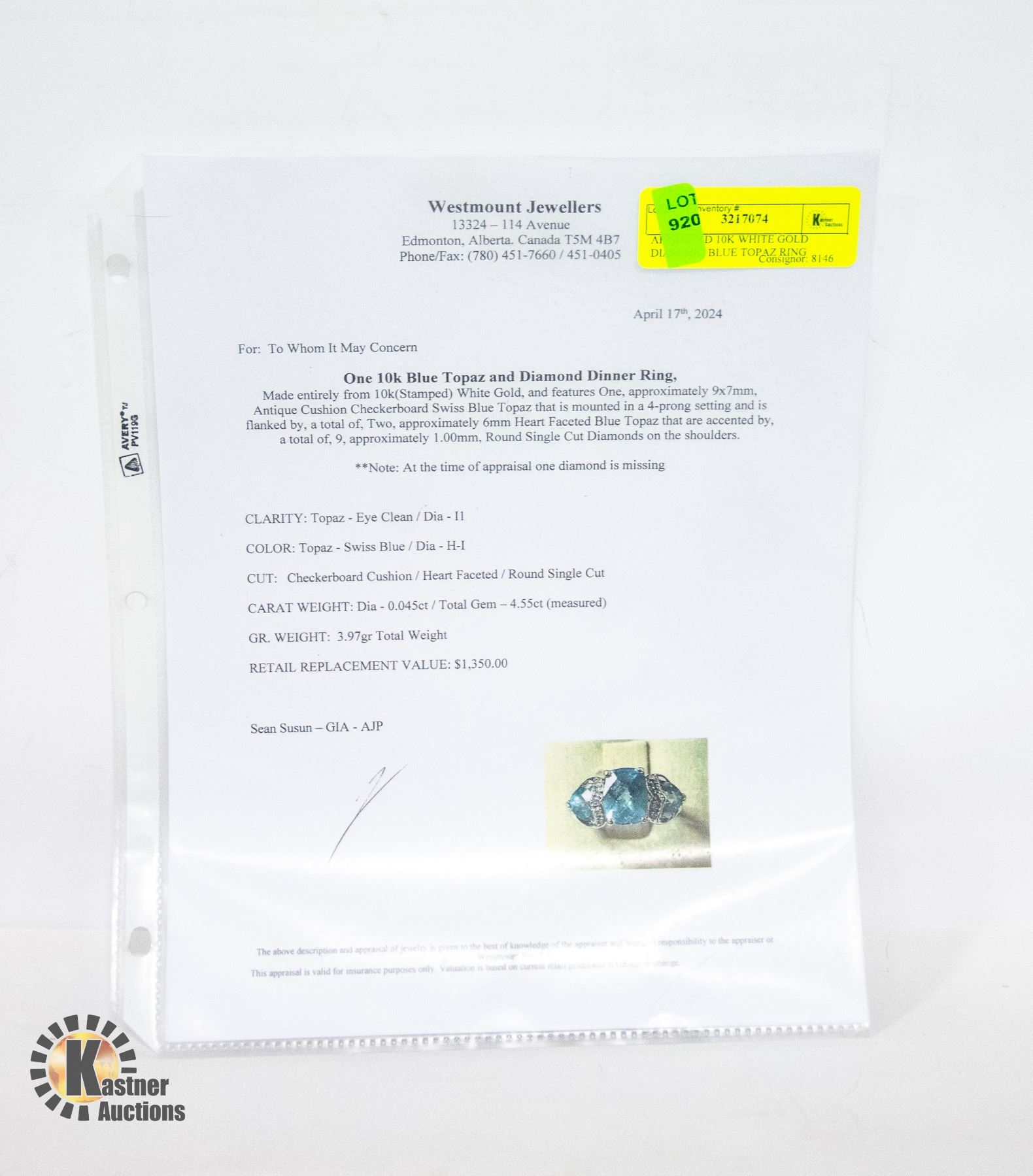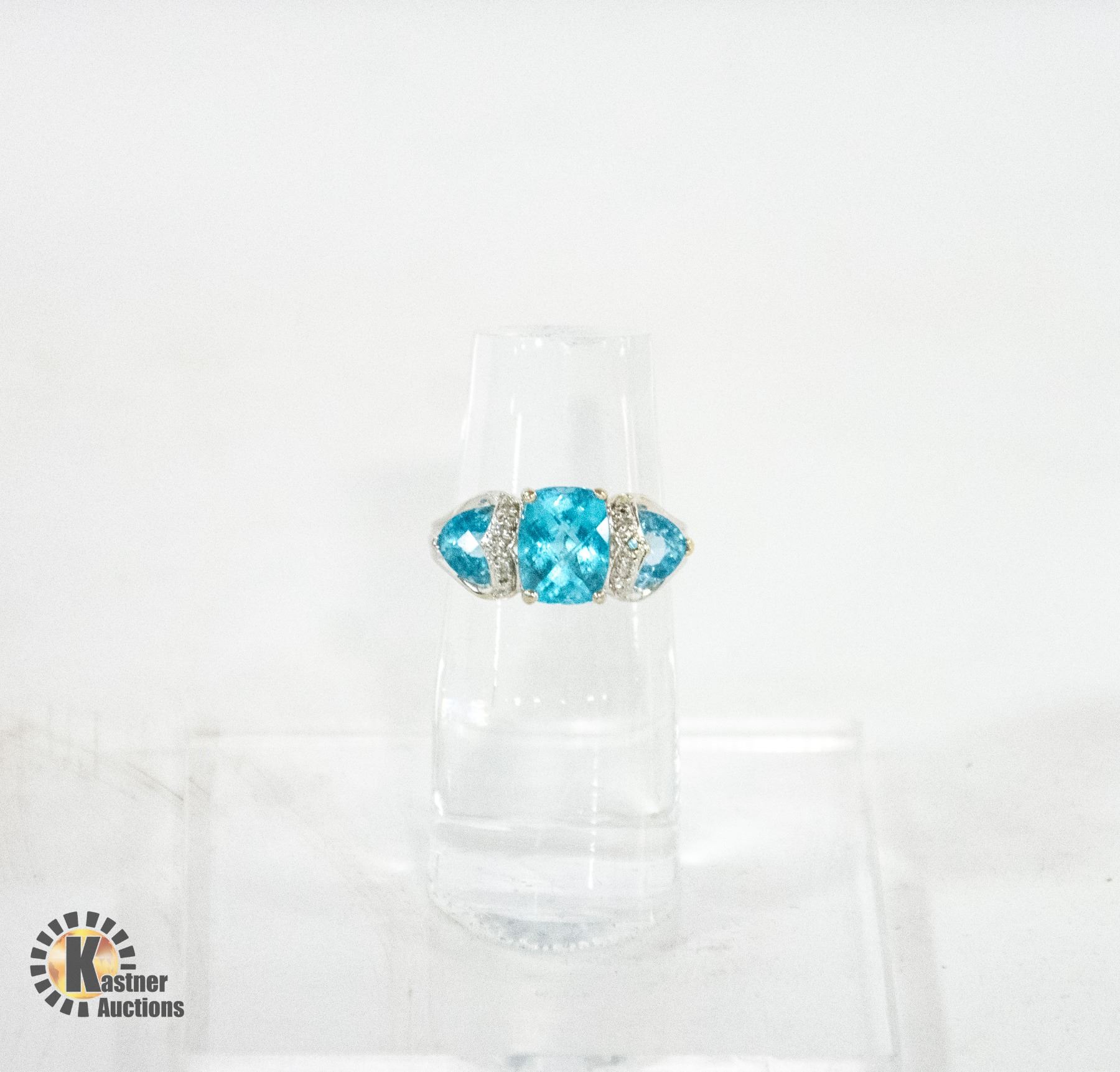 SIZE 6.75, ANTIQUE CUSHION CHECKERBOARD SWISS BLUE TOPAZ 4 PRONG MOUNTED WITH 9 ROUND SINGLE CUT DIAMONDS ON THE SHOULDERS. MISSING 1 DIAMOND AT TIME OF APPRAISAL, VALUE REFLECTS THAT. RETAIL REPLACEMENT VALUE $1350.00 **ALL ITEMS MUST BE REMOVED BY 5PM SATURDAY, JUNE 8TH 2024. ALL REMAINING ITEMS WILL BE SUBJECT TO A $6.00 PER DAY STORAGE CHARGE. ANY ITEMS REMAINING AFTER MONDAY, JUNE 24TH 2024 WILL BE CONSIDERED FORFEITED. NO REFUNDS WILL BE ISSUED FOR FORFEITED ITEMS. TO SCHEDULE A PICK UP APPOINTMENT CLICK HERE