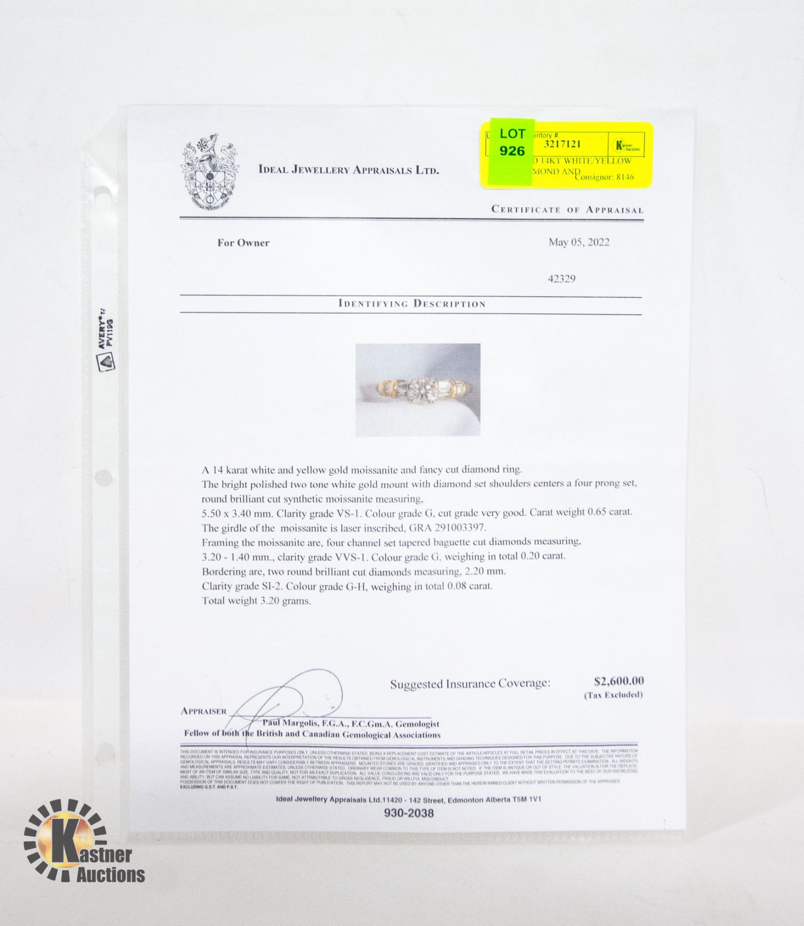 MOISSANITE RING SIZE 5, LASER INSCRIBED MOISSANITE GRA 291003397, 6 SHOULDERING DIAMONDS, APPRAISAL VALUE $2,600.00 **ALL ITEMS MUST BE REMOVED BY 5PM SATURDAY, JUNE 8TH 2024. ALL REMAINING ITEMS WILL BE SUBJECT TO A $6.00 PER DAY STORAGE CHARGE. ANY ITEMS REMAINING AFTER MONDAY, JUNE 24TH 2024 WILL BE CONSIDERED FORFEITED. NO REFUNDS WILL BE ISSUED FOR FORFEITED ITEMS. TO SCHEDULE A PICK UP APPOINTMENT CLICK HERE