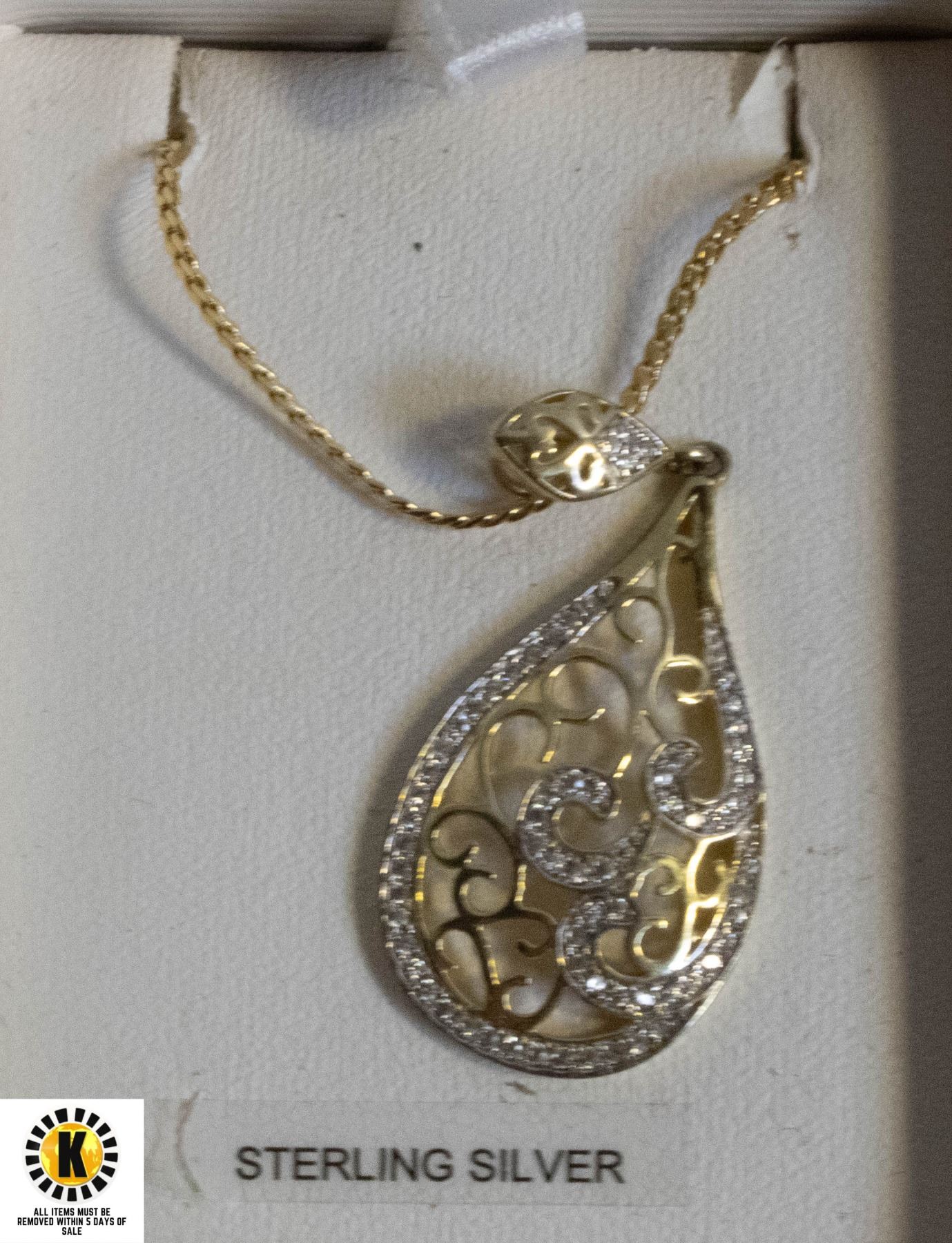 ASSEMBLED FANCY PENDANT. .925 SILVER WITH YELLOW GOLD PLATED CONTAINING: 65 ROUND CUT SYNTHETIC CUBIC ZIRCONIUMS, MEASURING 1.20-1.20X0.78MM, APPROXIMATE TOTAL WEIGHT OF 0.65CT., TOTAL WEIGHT OF PENDANT IS 3 GRAMS. MGI GEMOLOGICAL LABORATORY APPRAISAL SERVICES CERTIFICATE OF EVALUATION $400.00 APPRAISAL FROM 2015