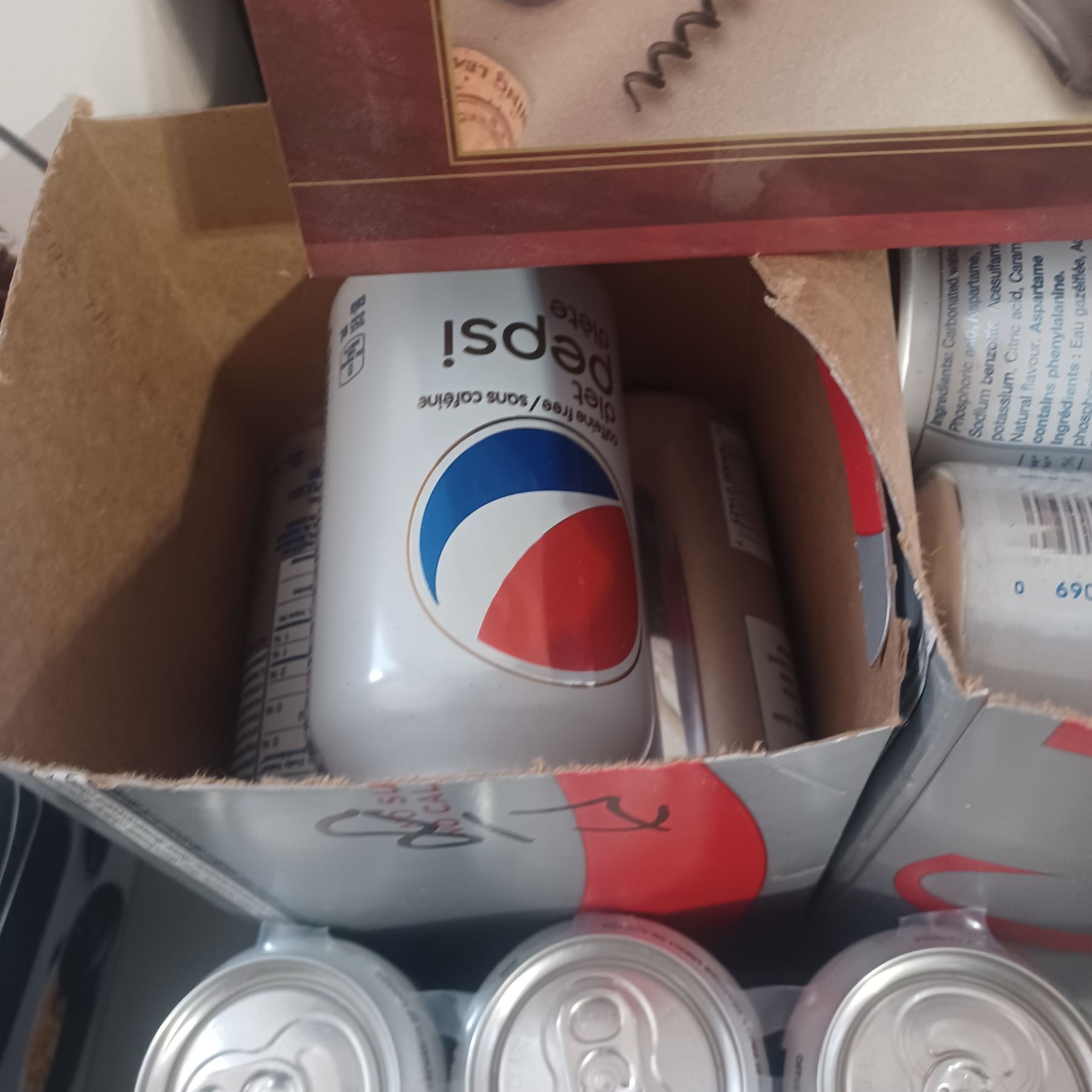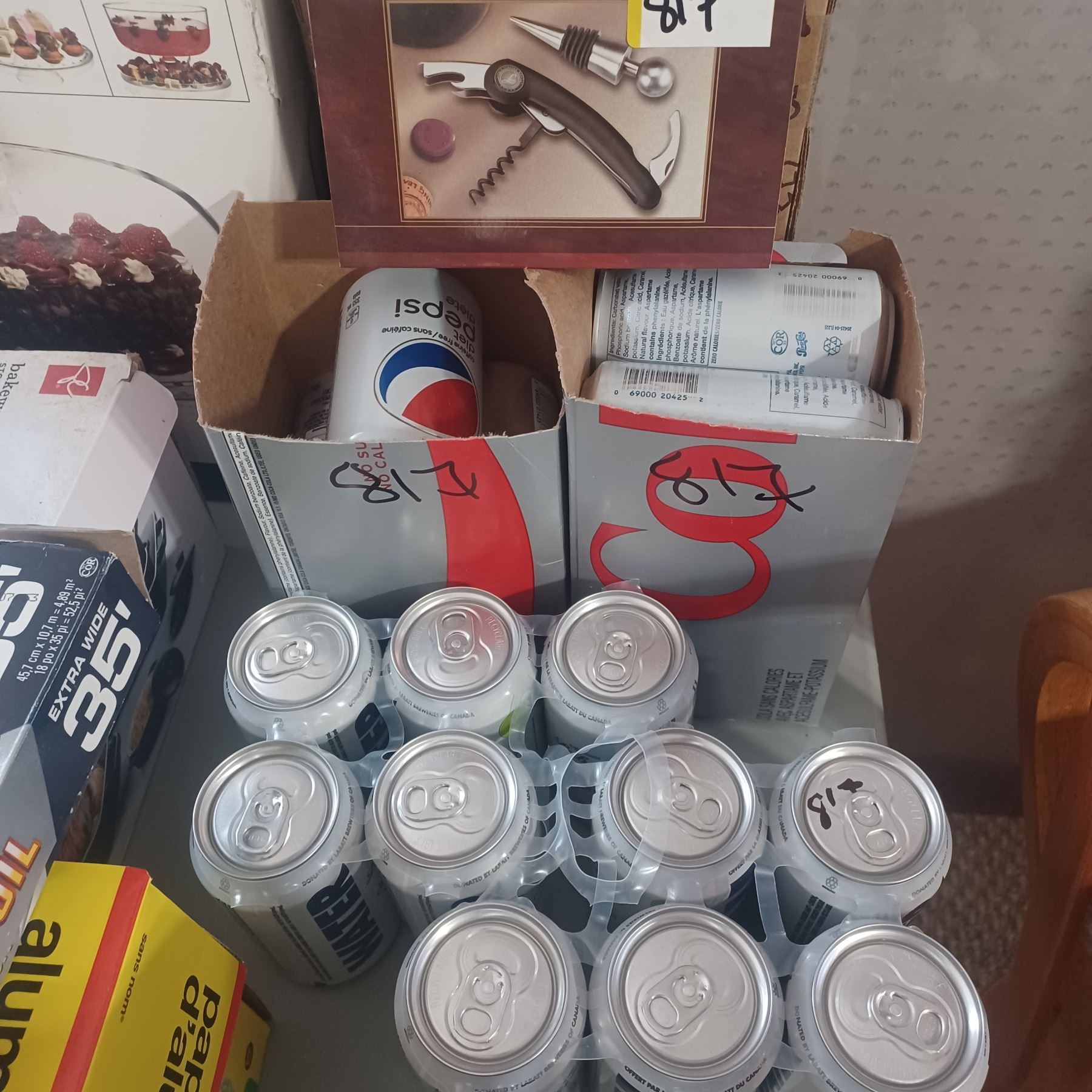 APPROX 12 CANS OF DIET COKE, NEW CORK SCREW AND 10 CANS OF LABBATS DRINKING WATER