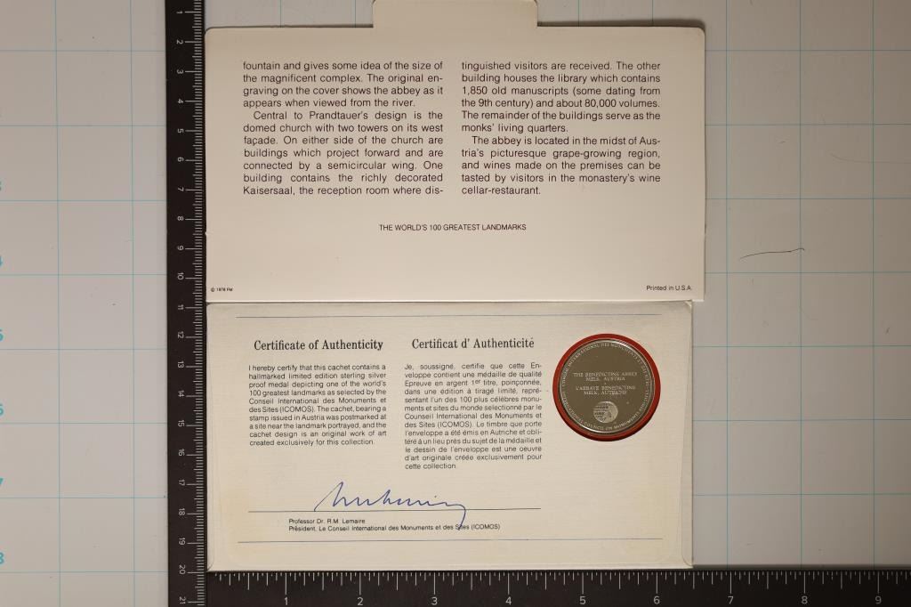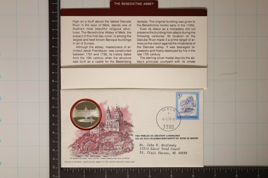 GREATEST LANDMARK SERIES. THE BENEDICTINE ABBEY, MELK, AUSTRIA. LIMITED EDITION BY THE FRANKLIN MINT SEALED IN FDC WITH OUTER INFO CARD.