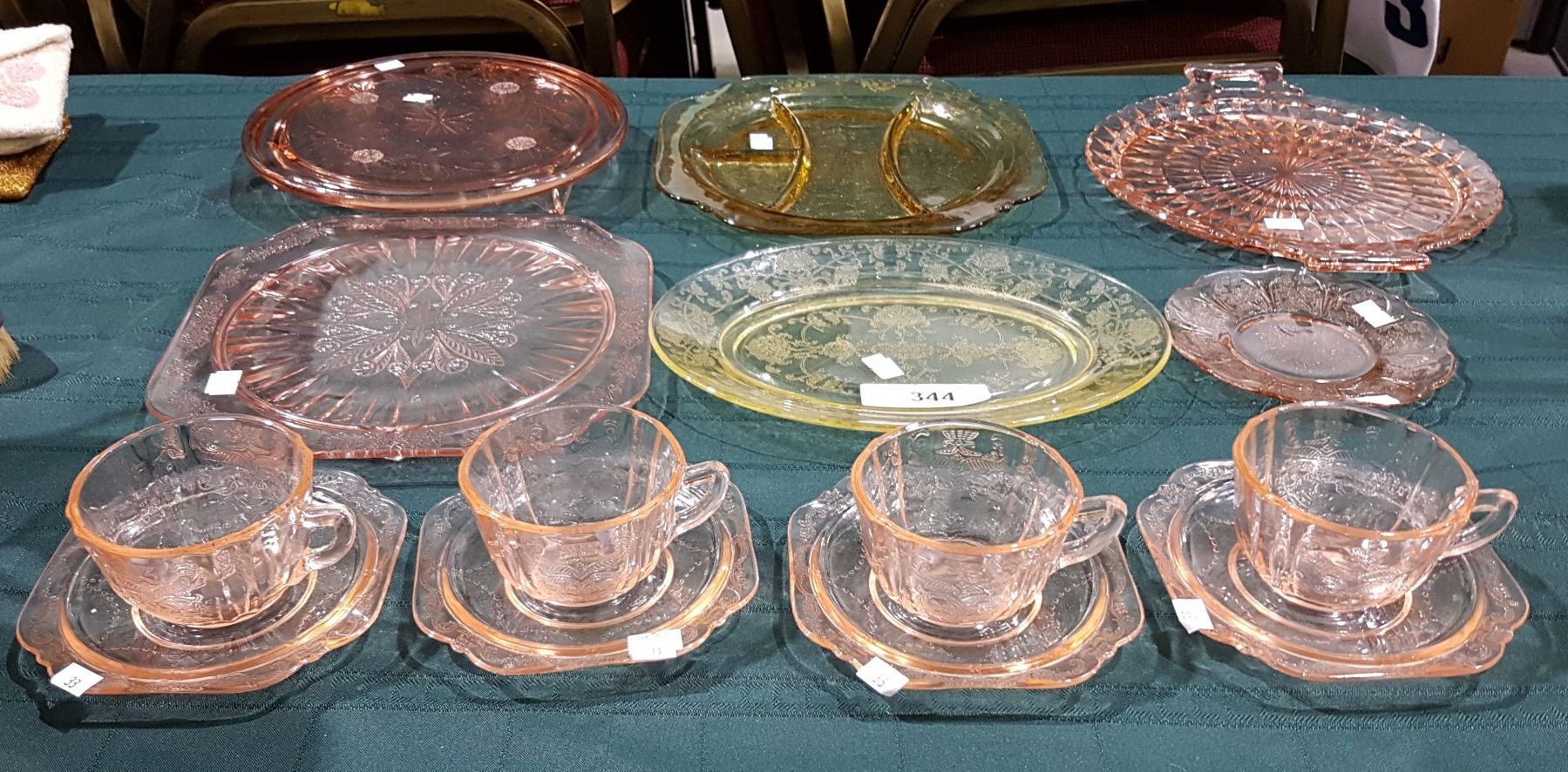 APPROX 14 PCS OF PINK AND AMBER DEPRESSION GLASS