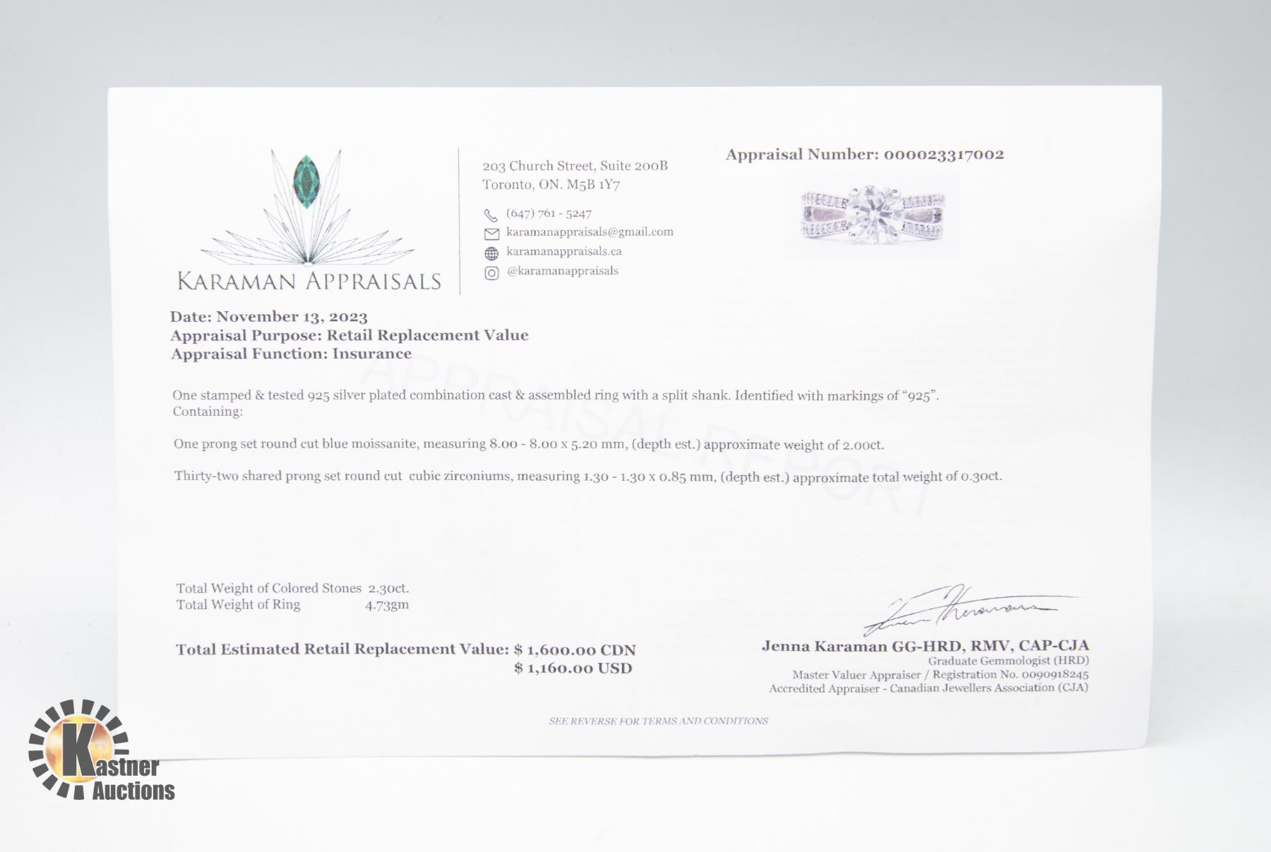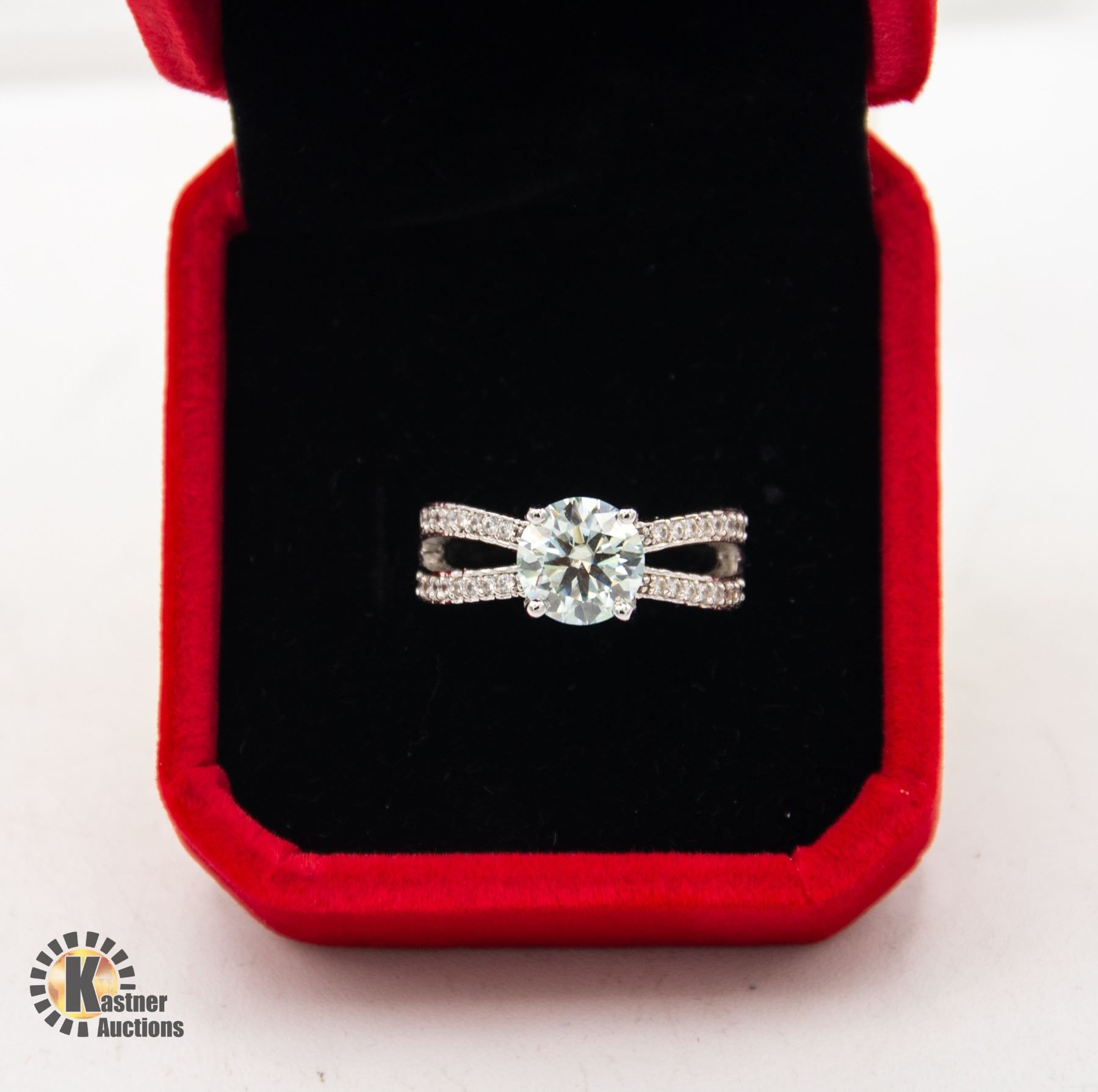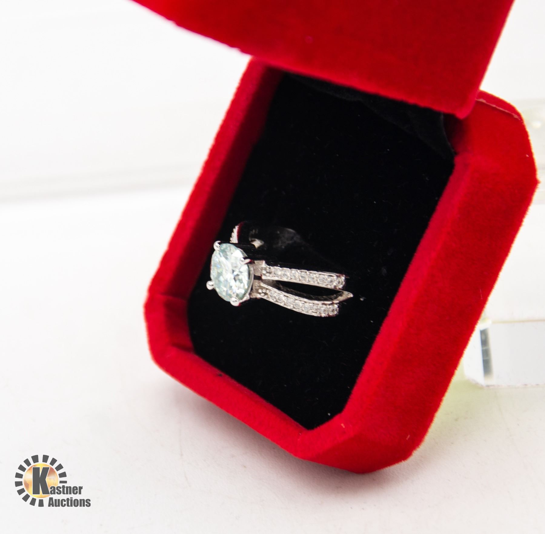 IN CENTER WITH 32 CUBIC ZIRCONIUM SET IN 2 SPLIT SHANKS WEIGHING A TOTAL 0.30 CARATS SET IN PLATED SILVER RING SIZE 7.5 APPRAISED VALUE $1,600.00 **ALL ITEMS MUST BE REMOVED BY 5PM SATURDAY, JANUARY 6TH 2023. ALL REMAINING ITEMS WILL BE SUBJECT TO A $6.00 PER DAY STORAGE CHARGE. ANY ITEMS REMAINING AFTER MONDAY, JANUARY 22ND, 2023 WILL BE CONSIDERED FORFEITED. NO REFUNDS WILL BE ISSUED FOR FORFEITED ITEMS. TO SCHEDULE A PICK UP APPOINTMENT CLICK HERE