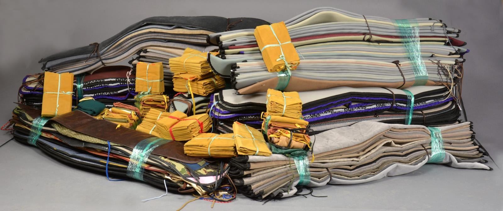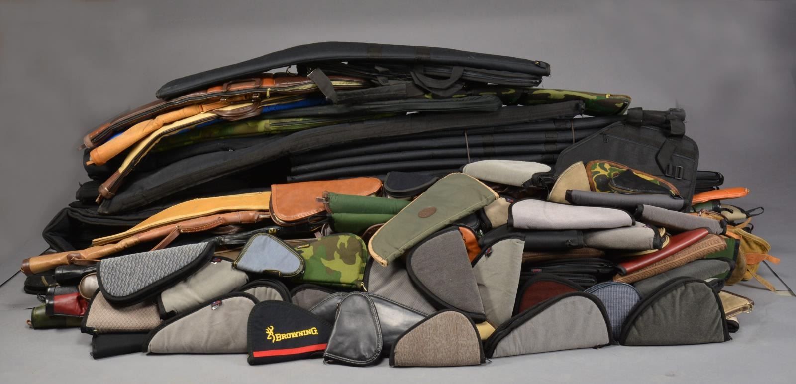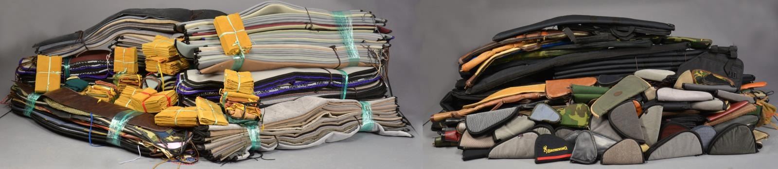 ZIPPER CLOSURE & SLIDE IN GUN CASES W/ TIE CLOSURES. Assorted styles, lengths & colors. Many are black. Materials are predominately nylon & plastic. CONDITION: ranges from good to near excellent. May have wear, scuffing, sm. tears, but all appear serviceable. (02-14120/RW). / Slide in gun cases having wide variety of colors & materials. CONDITION: ranges from good to very good. May have light wear, staining or scuffing, but all appear serviceable. (02-14122-1/RW). $250-450.