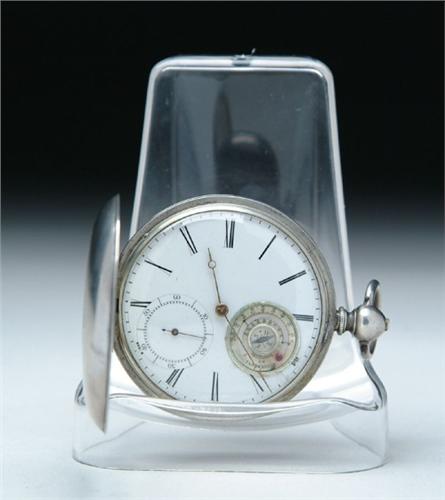APPROXIMATELY 18 SIZE SILVER POCKET WATCH. Close case. Unusual dial with thermometer and compass. Case is 54mm across. 15 jewels. CONDITION: Generally good, running. 9-25975