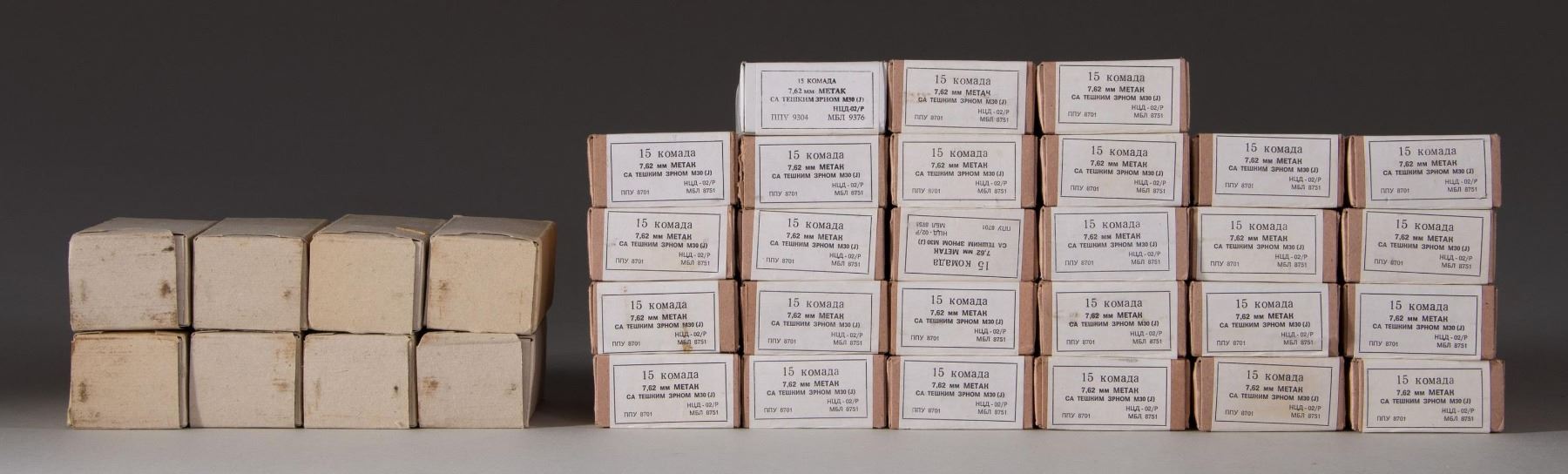 1). According to the cyrillic markings on box, this brass cased Berdan primed ammo is loaded w/ a heavy full metal jacket boat-tailed bullet. 405 rounds in twenty-seven 15 round paper boxes. 2). Steel cased Berdan primed full metal jacket ammo produced according to the "21 / 86" headstamp in East Germany. The plain paper boxes contain no further information as to bullet weight or corrosive priming. 160 rounds in eight 20 round unmarked boxes. Lot is contained in a green plastic "ammo can". CONDITION: ammunition appears bright, clean & serviceable. Most boxes are sealed, but boxes may have light handling wear. (02-24542-9/RW). AMMO. $200-400.