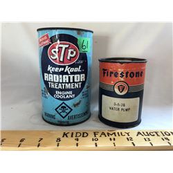 GR OF 2, 1 QT SZ STP RADIATOR TREATMENT TIN - FULL. FIRESTONE 3-A-28 WATER PUMP TIN.