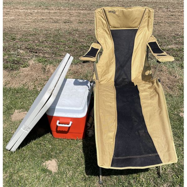 LOT OF 3 - FOLDING LOUNGE CHAIR, COOLER & FOLDING TABLE
