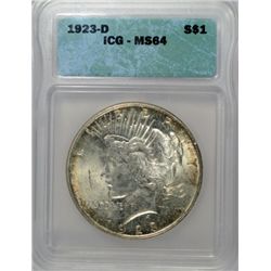 1923-D PEACE SILVER DOLLAR, ICG MS 64 NICE!