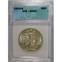 1933-S WALKING LIBERTY HALF DOLLAR ICG AU53 NICE146 - 1933-S WALKING LIBERTY HALF DOLLAR ICG AU53 NICE