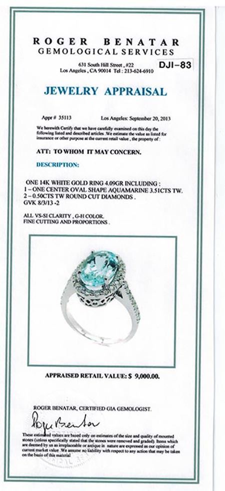 AQUAMARINE 3.51CT, 14K W/G RING 4.09GRAM / DIMOND RD 0.50CT