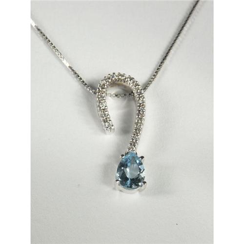 PENDANT WITH CHAIN: Enticing 14k white gold pendant on chain set with a pear shaped aquamarine and round cut diamonds. The sky blue aquamarine measures approximately 0.56 cts and is transparent. The diamonds measure approximately 0.12 ctw, have VS2 to SI2 clarity and H to I color. Appraisal included.