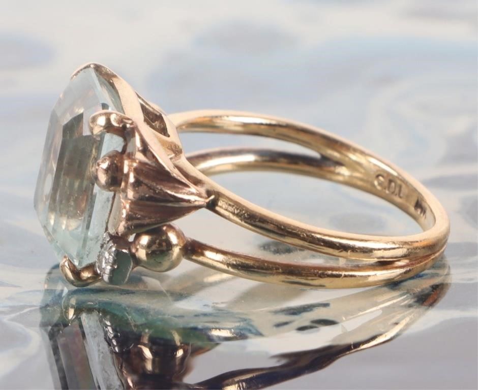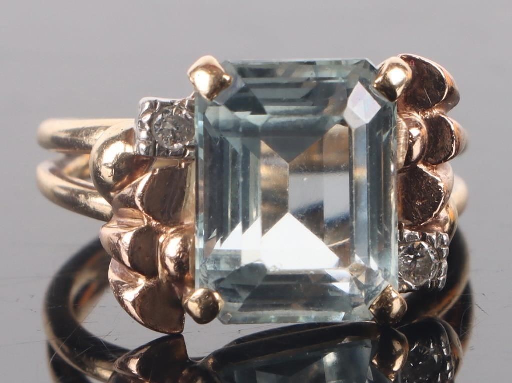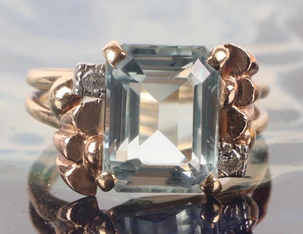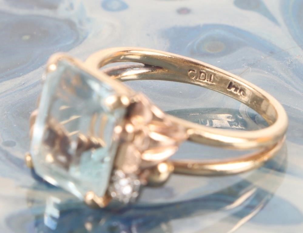 Aquamarine diamond 14K yellow gold ladies ring with a 11 X 9mm emerald-cut aquamarine, and two 0.02ct round diamonds.