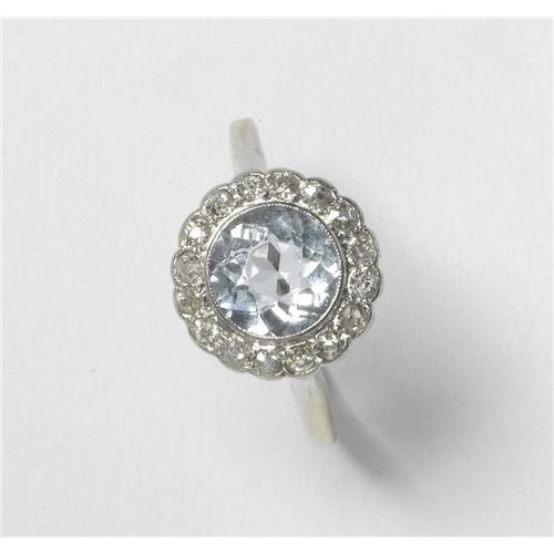 <B>AQUAMARINE, DIAMOND, 18K WHITE GOLD RING</B></I><BR><BR>The ring centers one round faceted aquamarine measuring 7.40 - 7.50 x 4.70 mm and weighing approximately 1.50 carats, encircled by European and single-cut diamonds weighing a total of approximately 0.50 carat, set in 18k white gold. Gross weight 3.30 grams.<BR><BR> <B>Condition Report:</B> Very good condition.<BR><BR><b>Shipping:</b> Miscellaneous Collectibles, Smal (<a target="_blank" href="http://www.heritageauctions.com/common/shipping.php">view shipping information</a>)