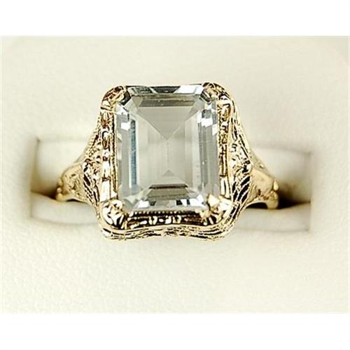 This Antique Style ring is an Authentic and Accurate copy of a ring CIRCA 1925 and THIS one is in MINT condition! It is a 14k Yellow Gold FILIGREE Ring featuring a beautiful Rectangular GENUINE AQUAMARINE = THREE CARATS! The AQUAMARINE is surrounded by very Beautiful Filigree work. This ring is a Size 6 1/2 and it can be resized either larger or smaller.