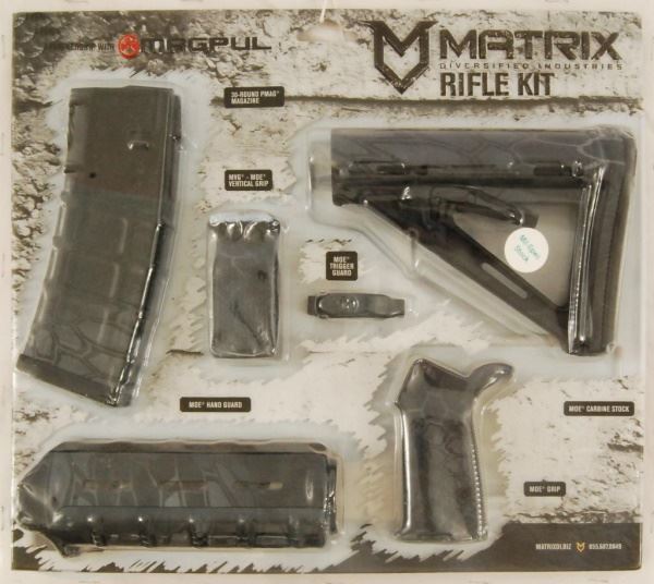 Comes with magazine, virtical grip, carbine stock, trigger guard, pistol grip, and hand guard. New in package.