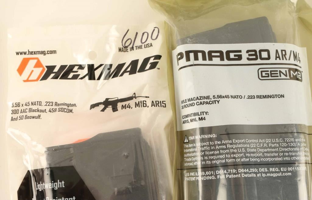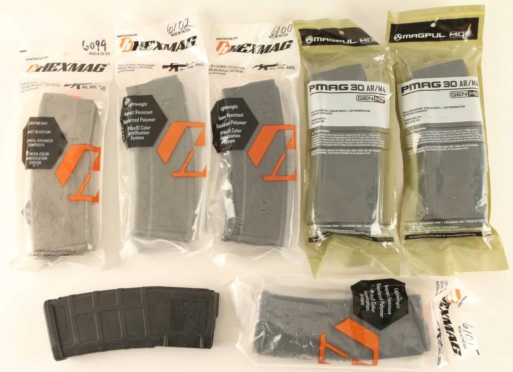 Total of Seven, 30 round, AR 15 Magazines. 3 Magpul Gen M2 (2 new in package) and 4 Hexmag (all new in package) 1 Black, 1 Gray, 1 OD Green and 1 FDE. See Photo