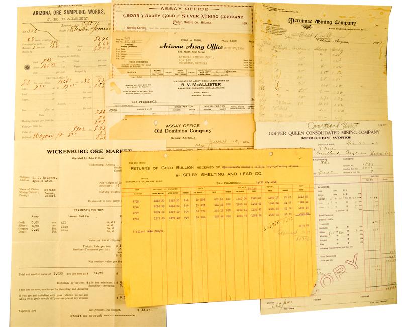 Lot of 10 Arizona assay documents covering roughly 45 years of assaying services by Arizona Ore Sampling Works (Kingman, AZ), Merrimac Mining Co. (Chloride, AZ), unissued Cedar Valley Gold and Silver Mining Co. (Cedar, AZ), Copper Queen Consolidated (Douglas, AZ), Selby Smelting and Lead Co. (Pearce, AZ), Bill and Jack (Wickenburg, AZ), Old Dominion Company (Globe, AZ), Wickenburg Ore Market (Wickenburg, AZ), Unissued R.V. McAllister (Kingman, AZ), Arizona Assay Office (Phoenix, AZ). Latter torn at left. Others in good condition. Varying sizes 6" x 9.5" to 8.5" x 11".