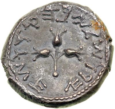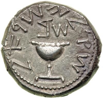 AR Shekel (14.1 g) dated year 2 (67/8 CE). Temple vessel with rim decorated with nine pearls; above, date. Reverse: Stem with three pomegranate fruits. Mesh 151; AJC II, 260, 8; H. 659. Dark patina; Extremely Fine.
