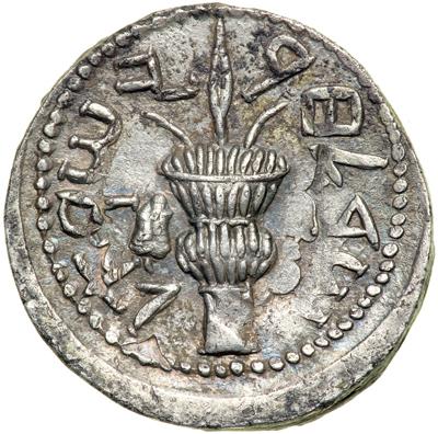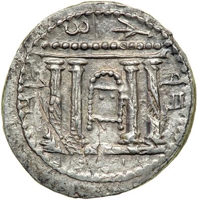 AR Tetradrachm (13.95 g) dated year 2 (133/4 CE). Tetrastyle façade of the Temple of Jerusalem; within the middle of the Temple interior, the Ark of the Covenant in chest form. Reverse: Lulav thrice bound; to left, etrog. TJC 229; Mild 8 [only two examples cited]; H. 686. Overstruck on a tetradrachm of Galba. Extremely Fine.