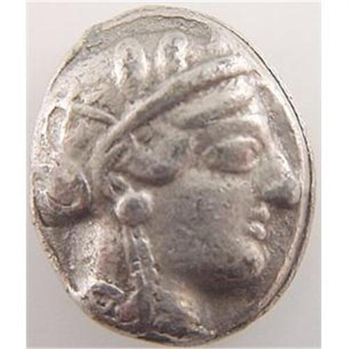 AR Tetradrachm old style, 500-479 B.C. Obverse is Athena, daughter of Zeus and goddess of wisdom and agriculture, almond shaped eye, wearing a crested helmet ornamented with three olive leaves which commemorate the victory of the Athenians over the Persians at Marathon and at Salamis. On the reverse an owl stands right, head facing, with an olive twig and a crescent above. Most likely a reproduction.