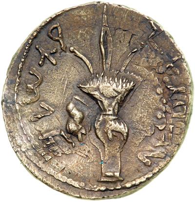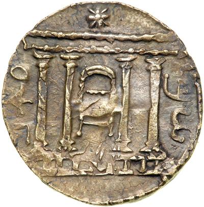 AR Tetradrachm or Sela (14.6 g) attributed to year three (134/135 CE). Tetrastyle façade of the Temple of Jerusalem; within the middle of the Temple interior, the Ark of the Covenant in chest form; Above, rosette. Reverse: Lulav thrice bound; to left, etrog. AJC 51; Mild. 57 [21 examples cited]; H. 711. Toned. Fine to Very Fine.