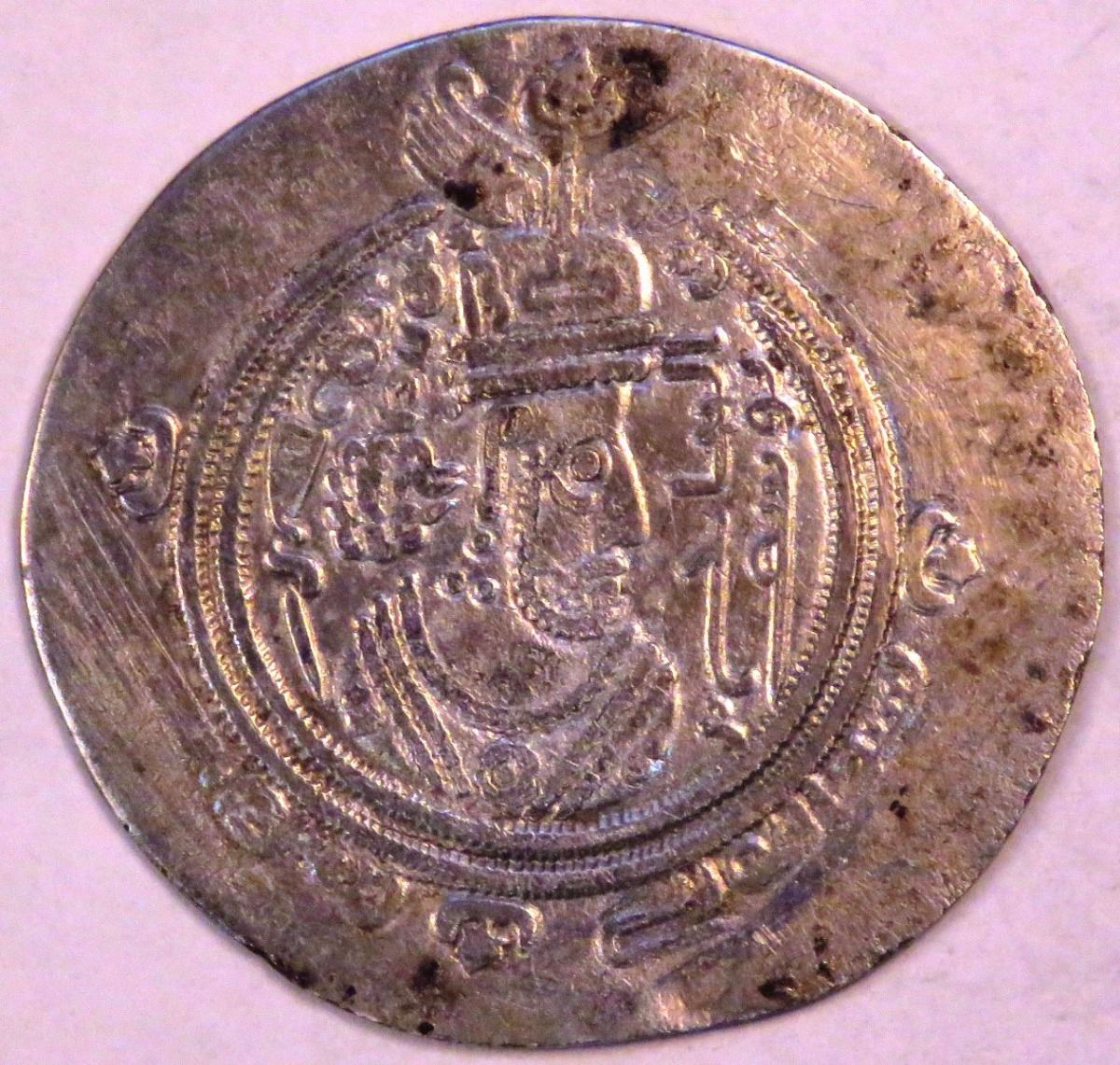 ARAB -SASANIAN, AL HAJJAJ B. YUSUF, DRACHM. BISHAPUR.Obv:Before bust:al-hajjaj ibn / yusuf(in Arabic);In second and third quadrants of border:bismilah rabbi (in Arabic) - Hsht (in Pahlawi), 2.90g,References:Walker p.120,Th.17:Gaube p.25, note 2.2.3.3.4., AH81, VF