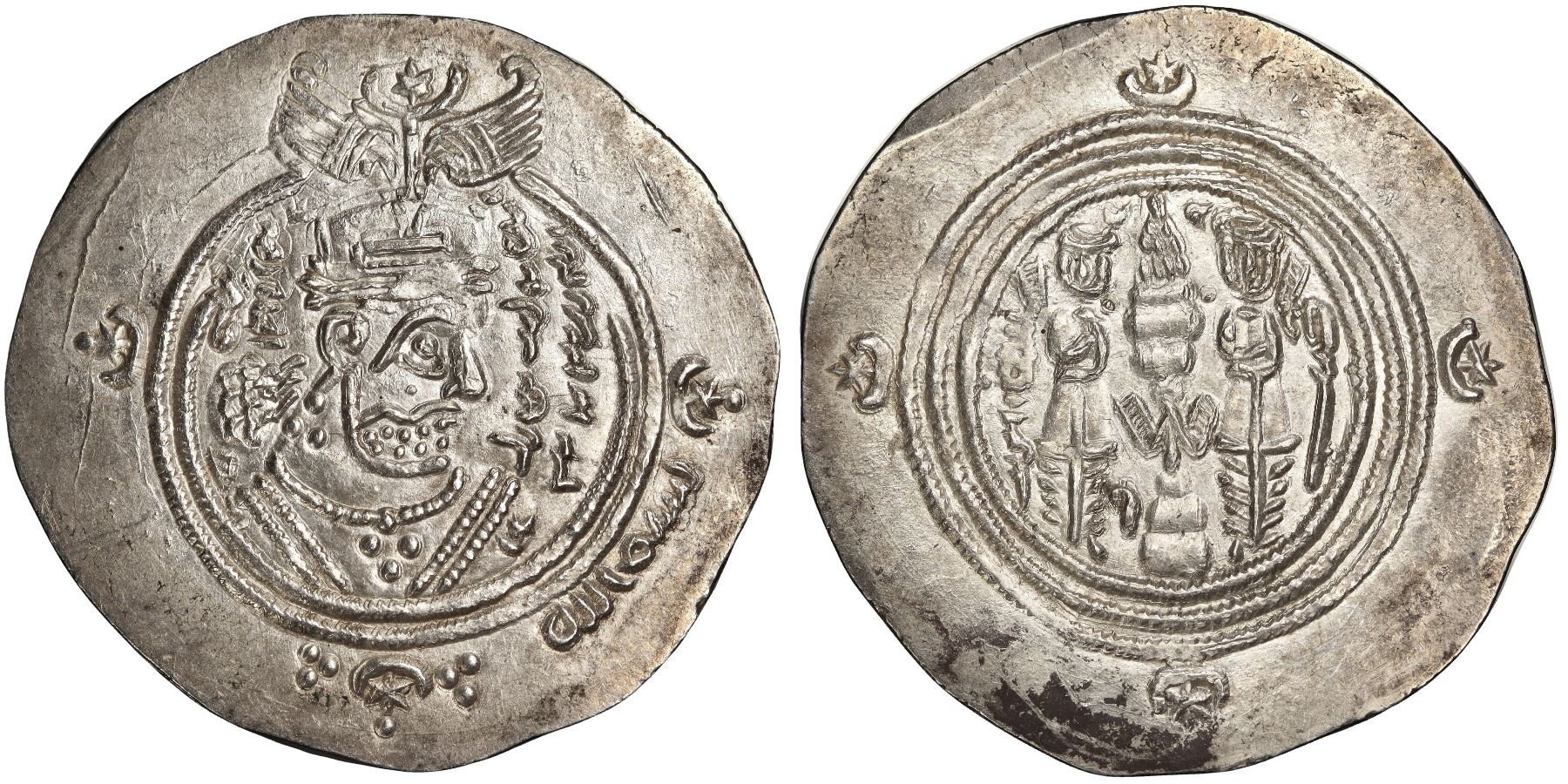 ARAB SASANIAN: 'Abd Allah Ibn Al-Zubayr (680-692), silver dirham (4.14g), DA (Darabjird) mint, YE 53 (AH 64). Al-Zubayr cited as "amir al-mu'mineen" ("commander of the faithful"). A-16. Choice extremely fine. Scarce.