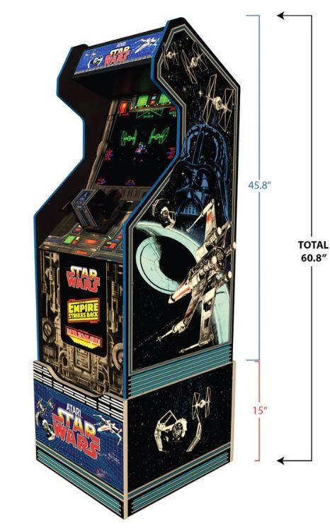 FROM THE MANUFACTURER: The Star Wars™ Home Arcade Game features the artwork from the original arcade machine on the cabinet and the included riser. The just over 5’ tall machine (with riser) comes with a light up marquee, full-color 17” display and dual speakers. These features, combined with the real-feel flight yoke and control buttons allow for endless hours of gaming! The Star Wars™ Home Arcade Game is easy to assemble and comes with a clear deck protector.