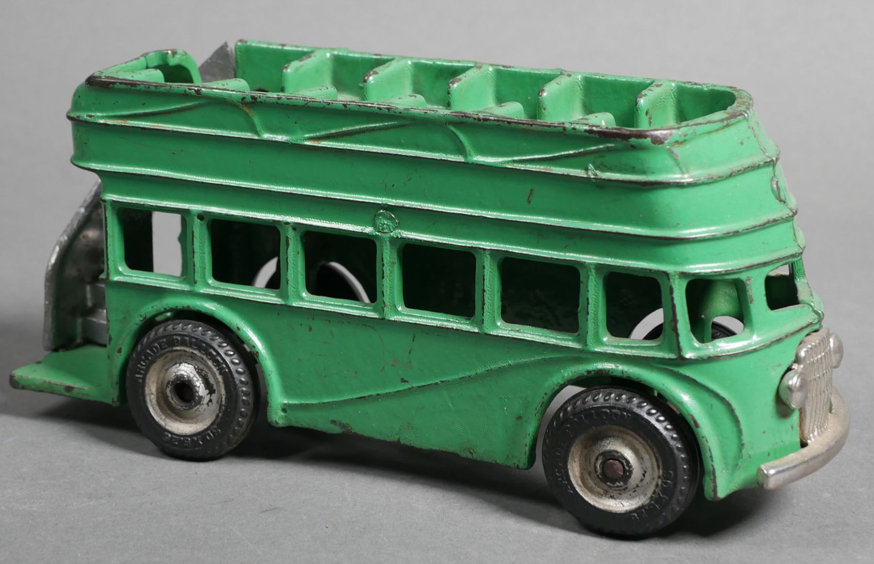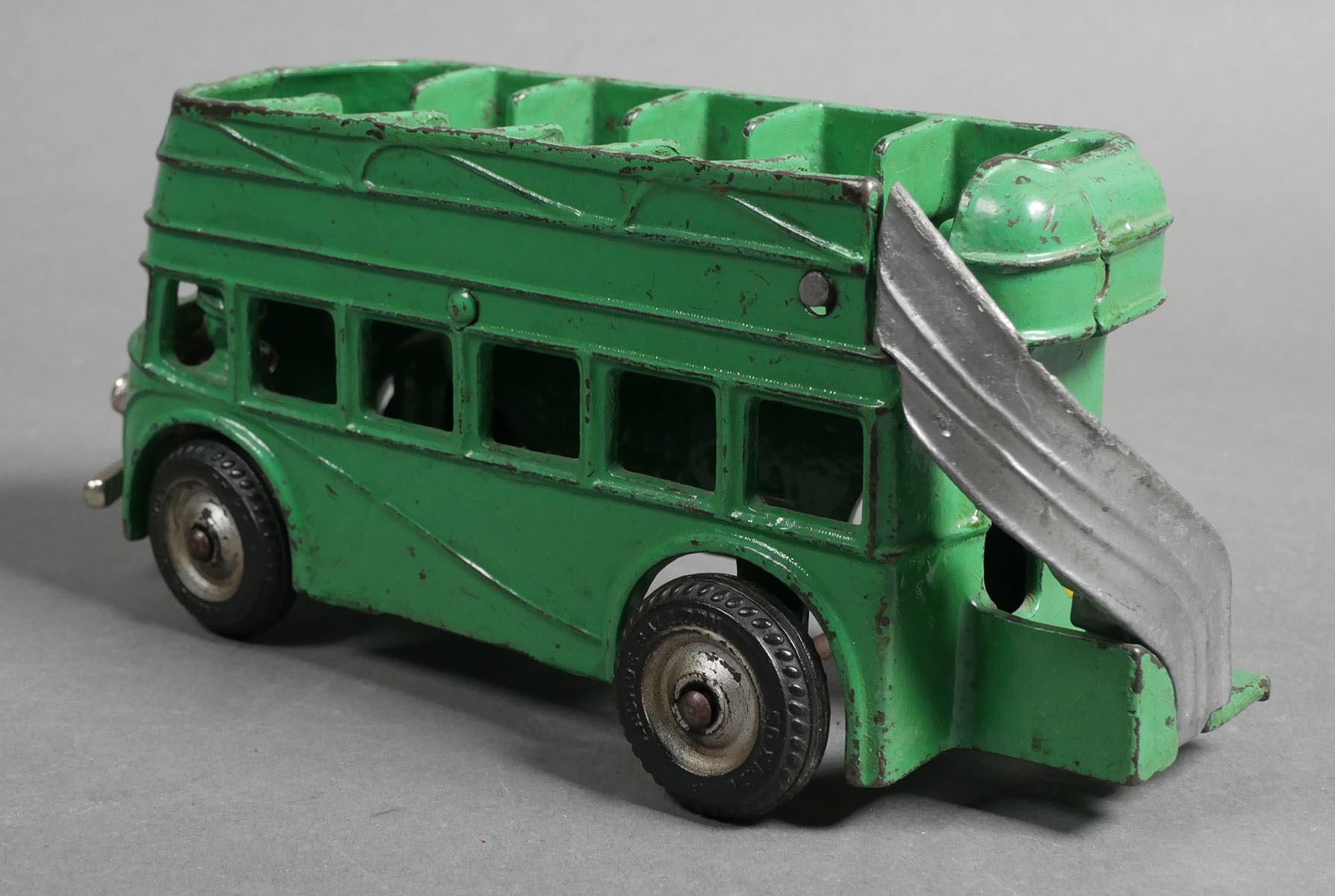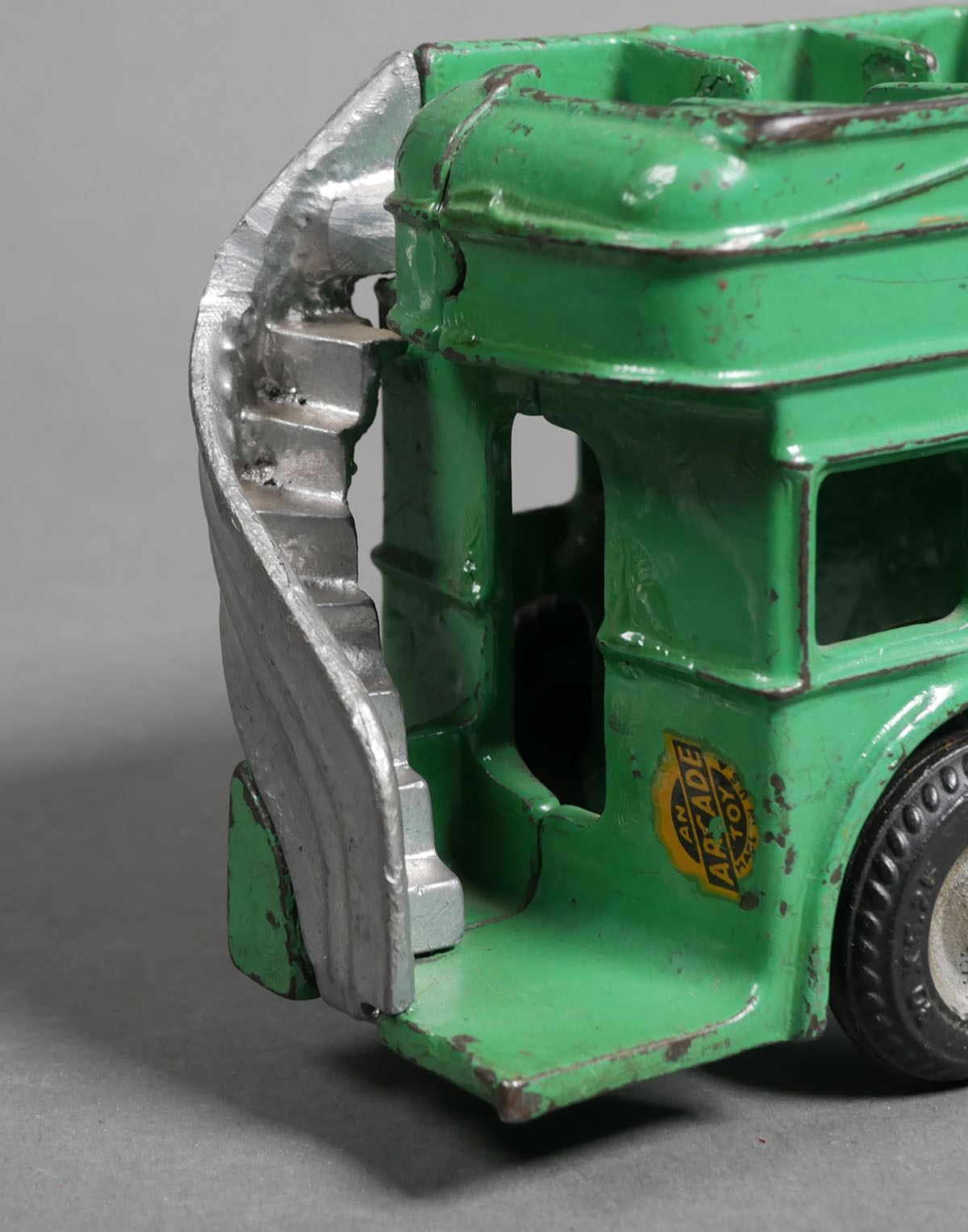 Arcade cast iron green double decker bus #318. Bus measures approx. 8" in length. The bus does have some normal wear & paint loss. Toy may have been re-painted at some point in time. Rear right tire comes off axle. Please see photos for more details on condition. The toys in today's auction are from a show dealer and have been in storage for over 15+ years. Some toys may require some level of cleaning and/or repair for operation.