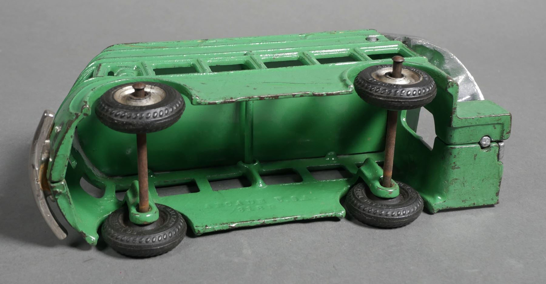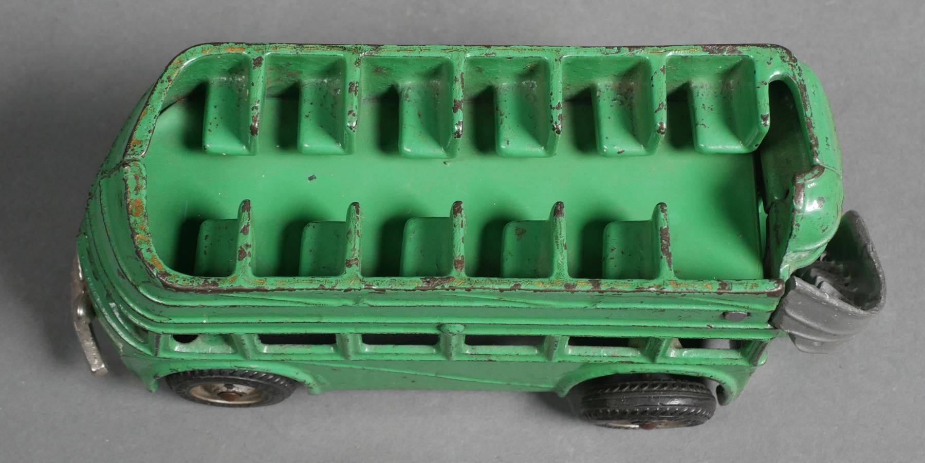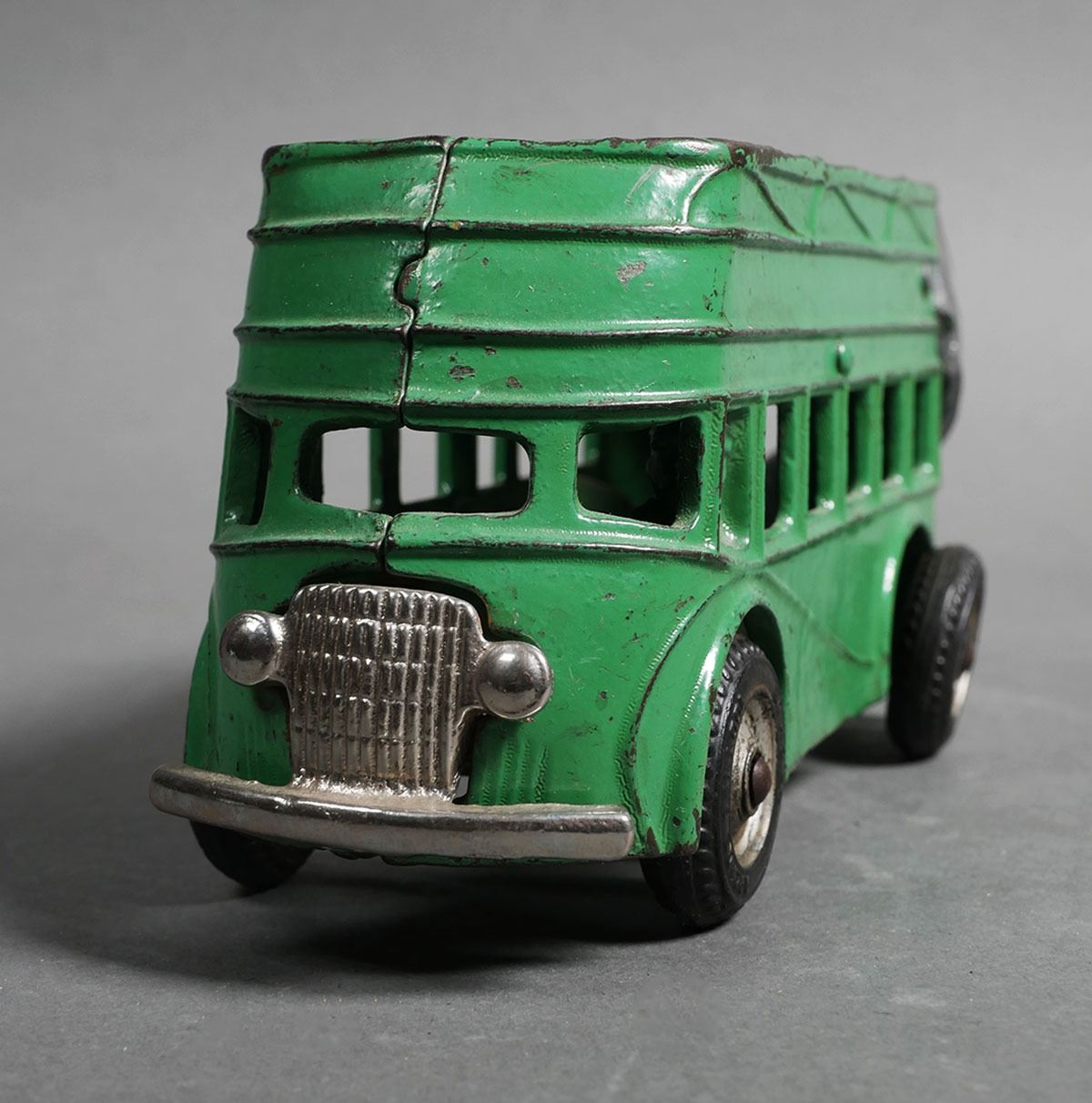 Arcade cast iron green double decker bus #318. Bus measures approx. 8" in length. The bus does have some normal wear & paint loss. Toy may have been re-painted at some point in time. Rear right tire comes off axle. Please see photos for more details on condition. The toys in today's auction are from a show dealer and have been in storage for over 15+ years. Some toys may require some level of cleaning and/or repair for operation.