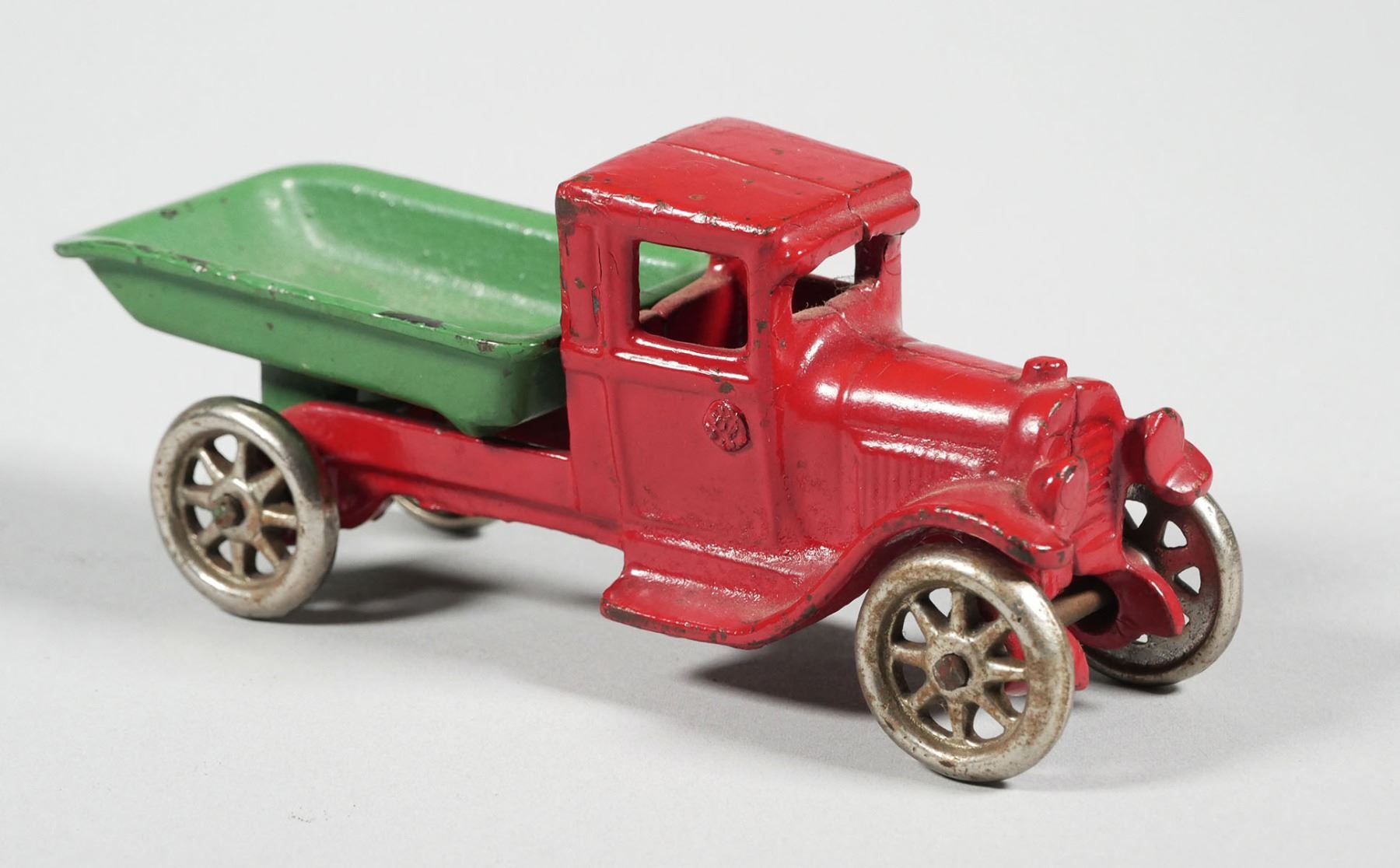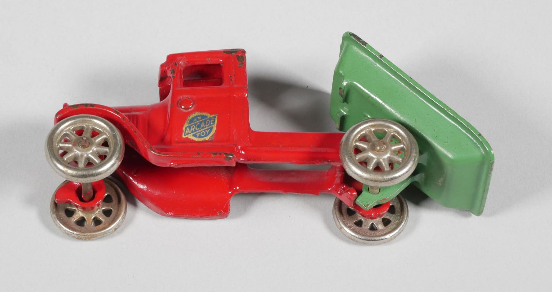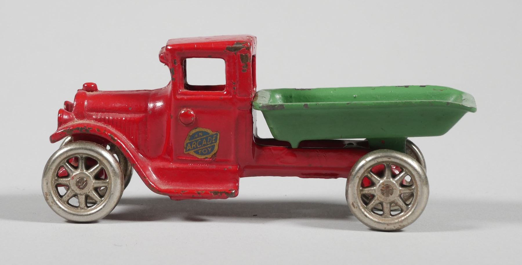 Arcade cast iron dump truck #2201. Toy car measures approx. 6" in length. The truck does have some normal wear & paint loss. Toy appears to have been re-painted at some point in time. Please see photos for more details on condition. The toys in today's auction are from a show dealer and have been in storage for over 15+ years. Some toys may require some level of cleaning and/or repair for operation.