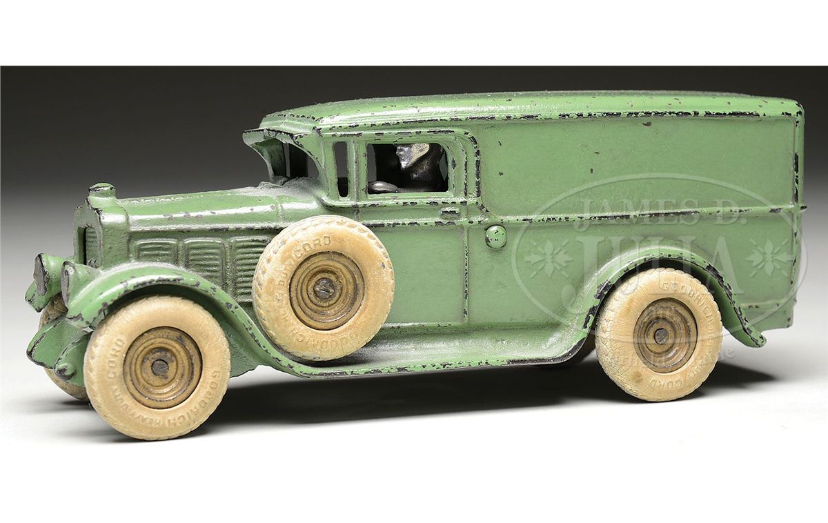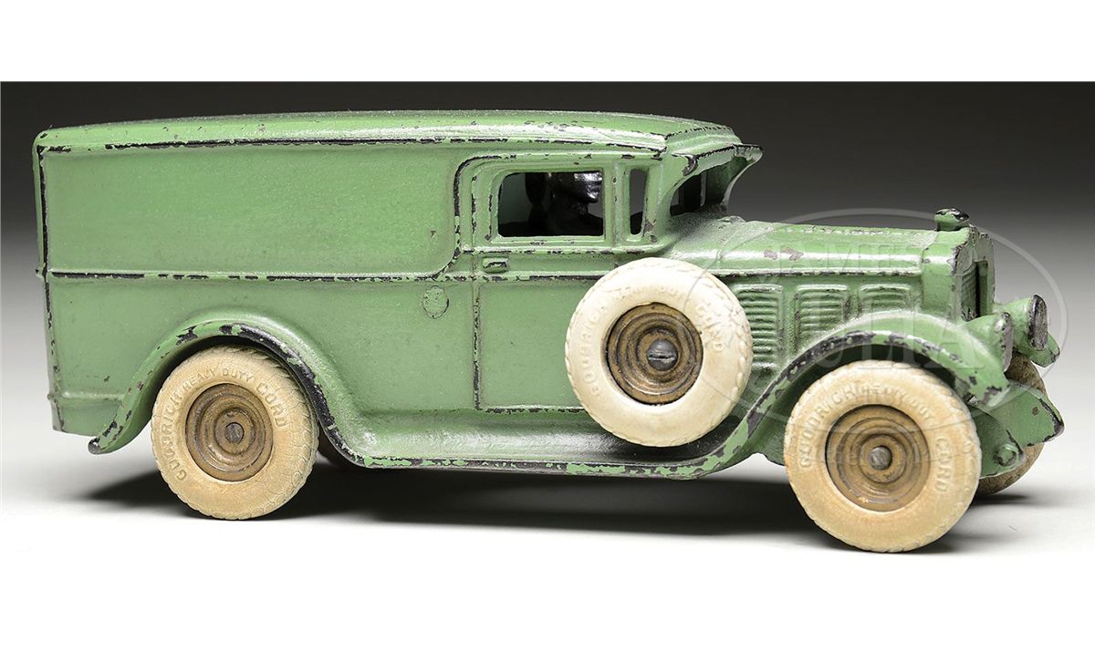A nice example of a hard to find panel truck produced by the Arcade firm. This vehicle has cast iron hubs with hard rubber tires and a pair of spares mounted on the cowls. Enameled in an apple green, this is a variation of one sold earlier that had the typical cast iron wheels. Formerly of the personal collection of Donald Kaufman (catalog number 2369). A most realistic truck and one of the more difficult panel trucks to obtain for one's collection. SIZE: 8-1/4" l. CONDITION: Overall older paint restoration. Rubber tire on right spare is replaced. 1-12850