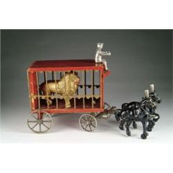 ARCADE WOOD CAGE WAGON. Very unusual circus toy with all original wooden back with tin side gates, cast iron nickel plated figure, two black cast iron horses with nickel plated plumes, and nickel plated wheels. Also features Arcade bank lion inside cage. Completely original. SIZE: 14 1/4". CONDITION: Very good, slight wear to wood areas. MC 1-3782 (300-400)