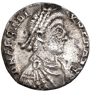 ARCADIO. Silicua. Roma. R/ Ley.: VIRTVS ROMANORVM. RIC-no. SB-no. Superficies ligeramente erosionadas. MBC.