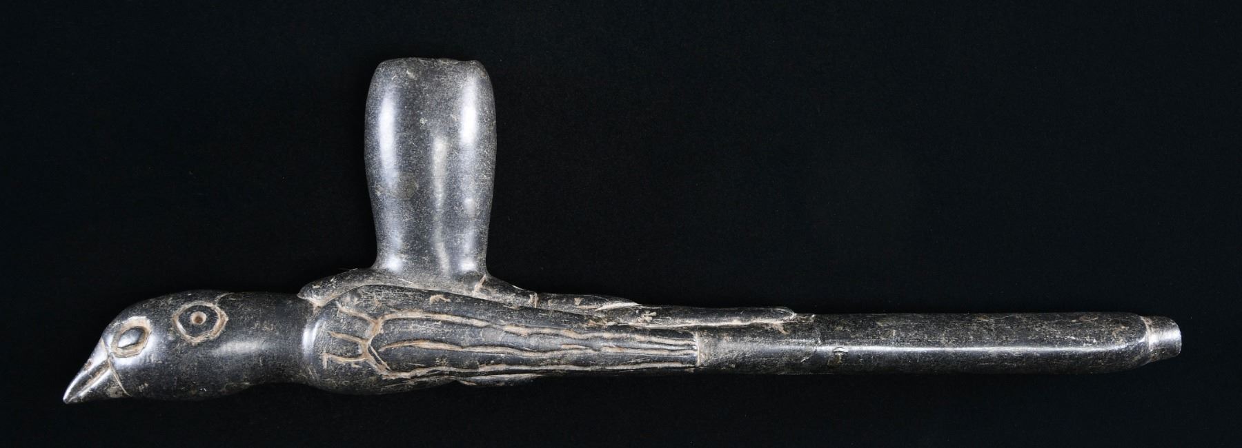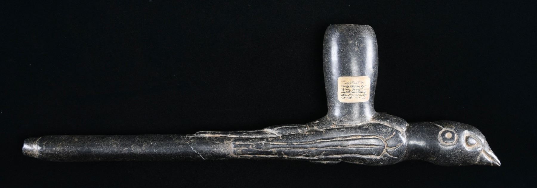 14" long, 4" high. An old collection tag reads: "This steatite bird effigy pipe came from the Lawrence Snall collection in Wythe County, VA". The pipe has unfortunately been broken about 5" up from the mouth piece. It appears to be a glue repair but reasonably well done. Despite the repair, it is a very attractive pipe and displays superbly. CONDITION: very good overall with some visible dirt and patina. As noted above, the stem section has a repair. PROVENANCE: Martin Lane Historic & Western Americana Lifetime Collection. (02-22976/JS/BF). $400-800.