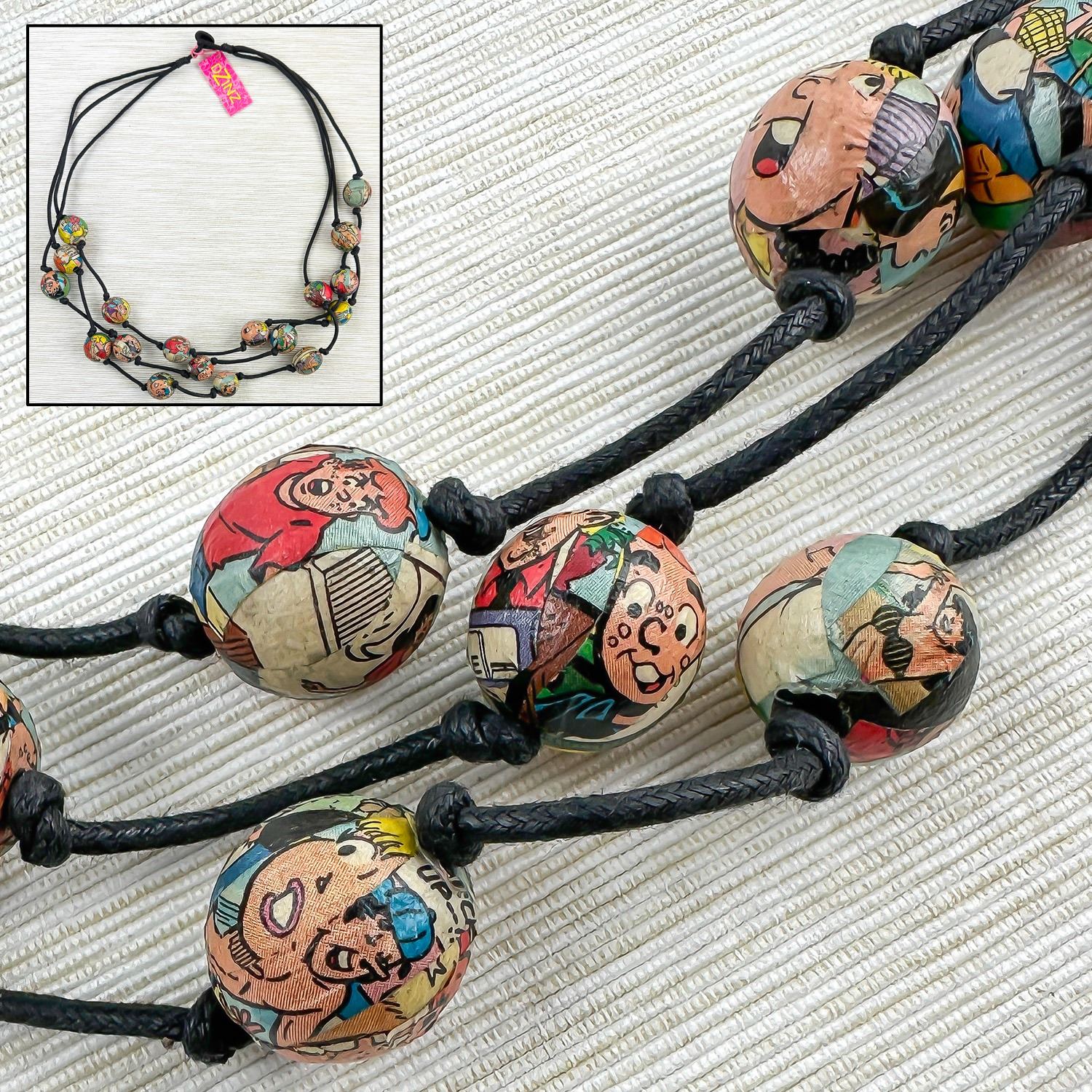 #8694 - NEW WITH DZINZ IMPORTED TAG. ARCHIE COMIC BALL NECKLACE - MADE OF RECYCLED ARCHIE COMICS. PAPER MACHE STYLE COMIC CHARACTER COSTUME JEWELRY. THIS IS A 3-STRAND 18 BALL NECKLACE WITH BLACK CLOTHING BUTTON CLASP. COMIC BALLS ARE ATTACHED WITH A BLACK LEATHER OR LEATHER-LIKE NECKLACE MATERIAL. MEASURES: 15” (38 CM) LONG UNCLASPED. THE COMPLETE OPEN LENGTH IS 30” (76 CM) LONG