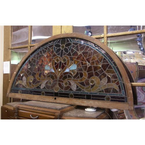 STAINED GLASS: Outstanding demilune-shaped stained glass window with wood frame, glass portion of slag and stained glass studded with cut glass cabochons. Wear commensurate with age. Approx. 96'' x 48.5''