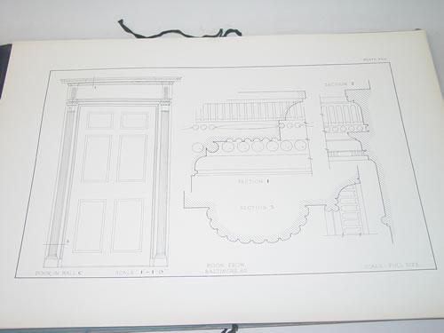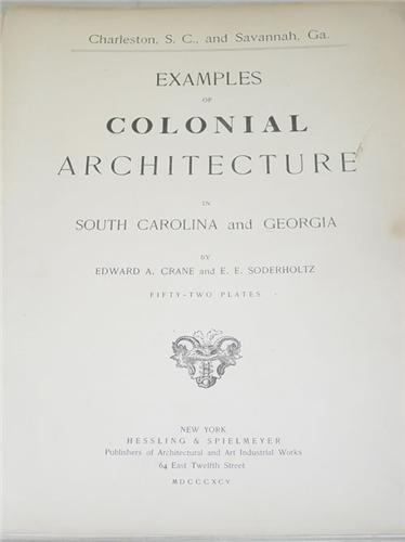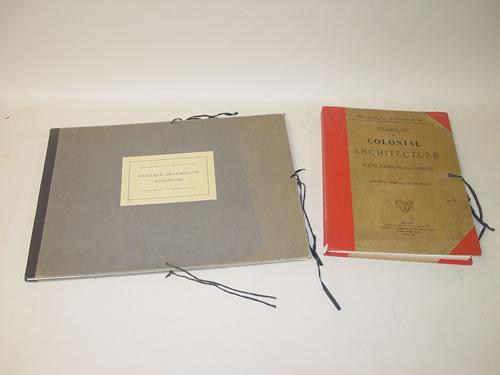 ARCHITECTURE. A Group of 2 Volumes as Listed. Hard Cover. Ex-Library. Good Condition. ***Examples of Colonial Architecture in South Carolina and Georgia By Edward A. Crane and E.E. Soderholtz (1895) NY: Hessling & Spielmeyer. Folio. Title, List of Plates and complete with 52 b/w photographic plates on hard stock (two are double page), unbound as issued, in a portfolio with ties. Backstrip reinforced with library cloth tape, edge chips to List of Contents. ***Measured Drawings of Woodwork Displayed in the American Wing (1925) NY: Metropolitan Museum of Art. Folio, horizontal format, Title, Table of Contents, complete with 40 b/w line drawings, unbound as issued, in a portfolio with ties.